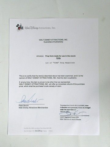 Premiere Props nor the consignor makes any warranties, expressed or implied, as to merchantability or fitness for a particular purpose, the correctness of the catalogue or other description of the physical condition, size, quality, rarity, importance, medium, provenance, exhibitions, literature, historical relevance of any property, intended use, condition of the property (including any condition report), correctness of description, origin, measurement, quality, rarity, importance, exhibition, relevance, attribution, source, provenance, date, authorship, condition, culture, genuineness, value, or period of the property. Additionally, neither Premiere Props nor the consigner makes any representation or warranty, expressed or implied, as to whether the Bidder acquires any copyrights, including but not limited to any reproduction rights of any property, or other intellectual property (including exhibition or reproduction rights) or whether the property is subject to any limitations such as ‘droit morale’ (moral rights) or other rights affecting works of art. Premiere Props does not make any representation or warranty as to title.