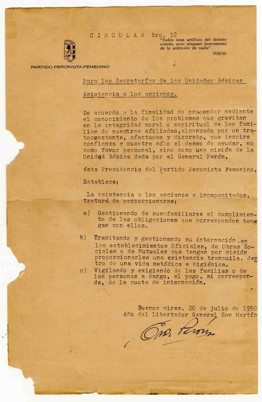 Typed letter signed by Eva Peron while First Lady of Argentina. Typed on official ''Women's Peronist Party'' letterhead. Letter is datemarked Buenos Aires, 20 July 1950, and declares that ''...this Chair of the Women's Peronist Party establishes that Assistance to the old and disabled people shall be provided...'' Peron's reputation for tireless service to those in need is illustrated in this decree. Signature in blue ink is very dark. Letter measures 6.75'' x 10.5''. Some paper loss along the left margin, otherwise very good condition.