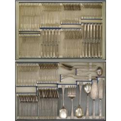 Pest, 20. sz. elso harmada, ezüst, Keszler Testvérek, vágott angol nyéllel, 12 db evokanál, evovilla, evokés, vacsoravilla, vacsorakés, halasvilla, halaskés, kompótoskanál, fagylaltoskanál, 6727,6 g + cca 420 g nyél= 7147,6 g, süteményesvilla, teáskanál, mokkáskanál, 11 db tálaló, csináltatott dobozában