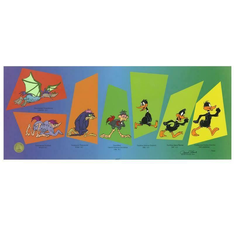 "Evolution Of Daffy" is a limited edition animation cel with hand painted coloring on sericel outline. The piece is numbered hand signed by Chuck Jones (1912-2002) and includes a Certificate of Authenticity! Measures Approx: 33" x 13.5"