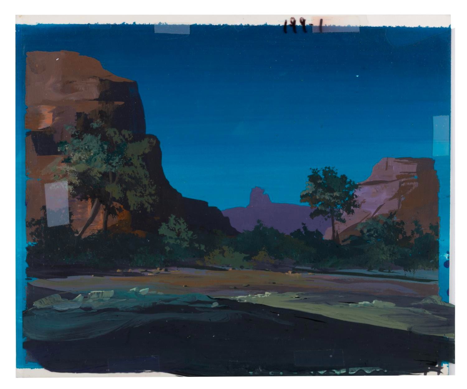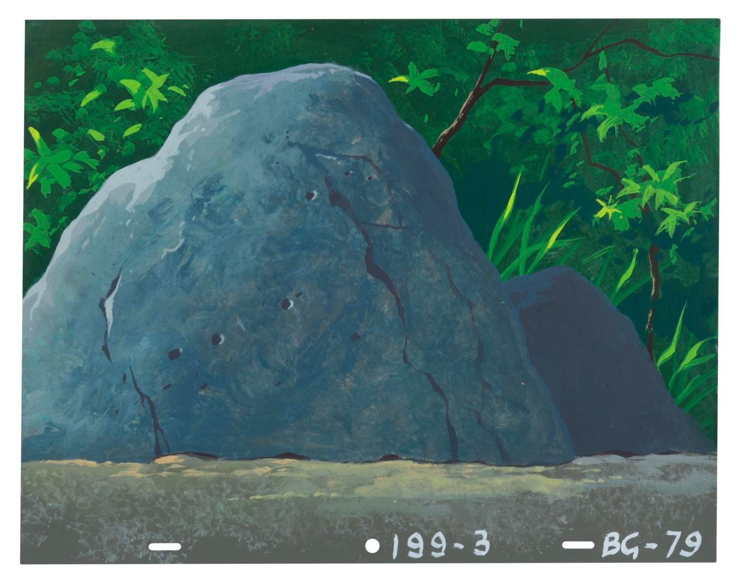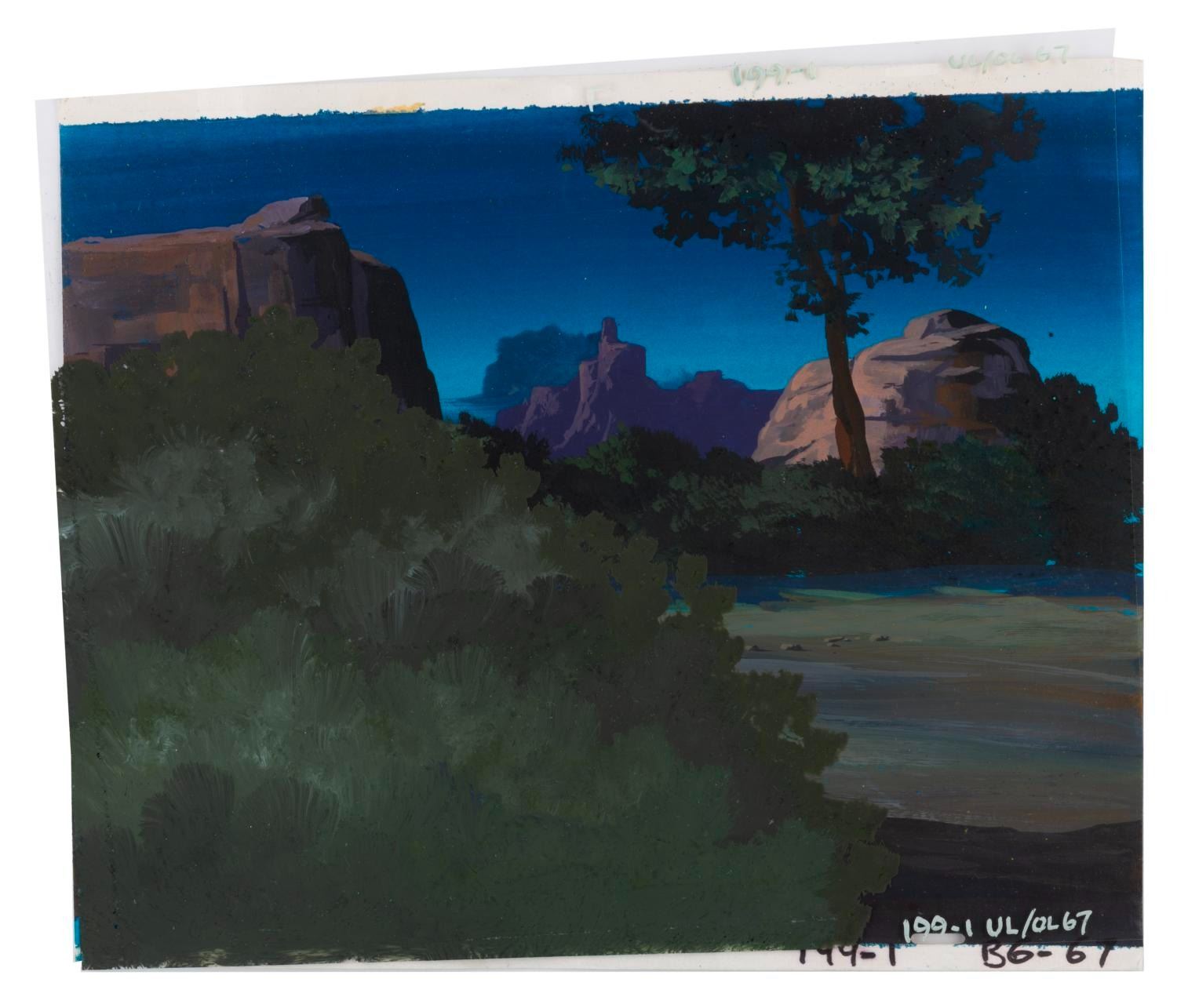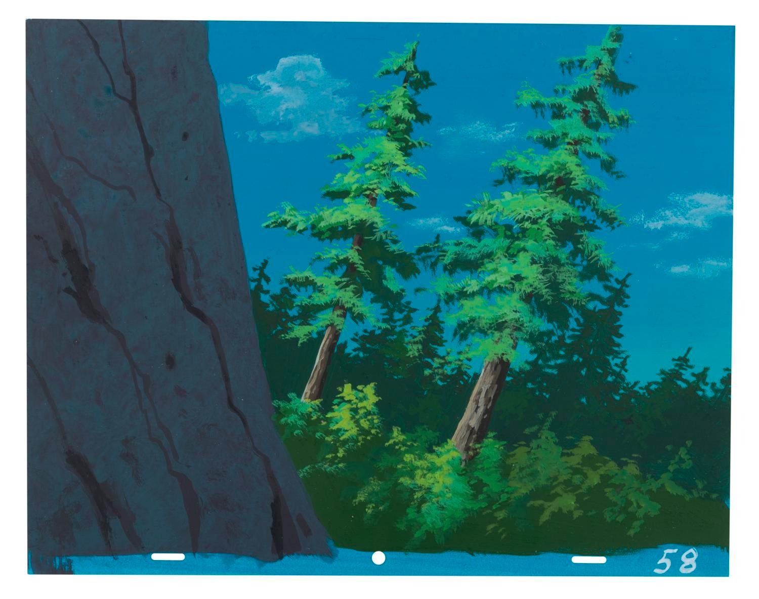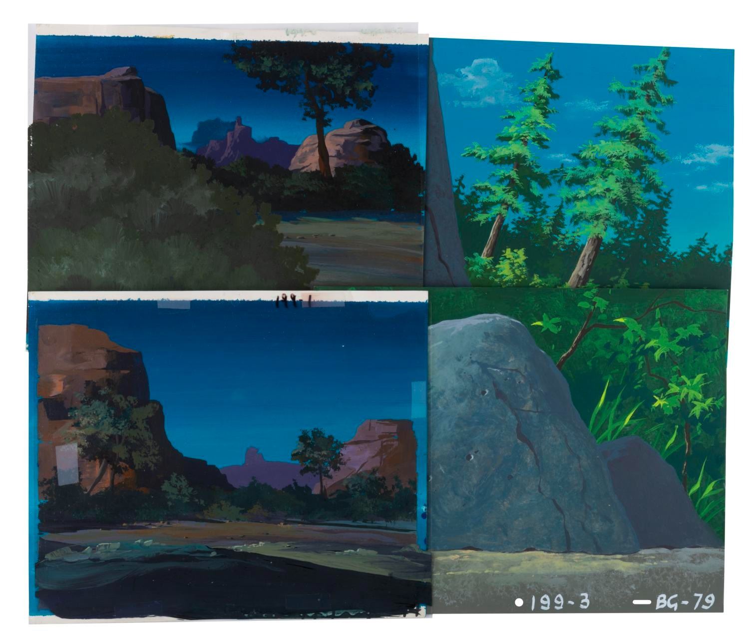 (Lucasfilm/Nelvana, 1985) A collection of four original background paintings from the “Ewoks” animated series. Two backgrounds include overlay scene cels that are adhered in place from age, and cannot be removed. Each measuring 10.5” x 12.5”, the backgrounds accomplished in gouache and cels display in very good condition, with typical wear from production use and age, and a 3” tear to the unpainted corner of one cel.