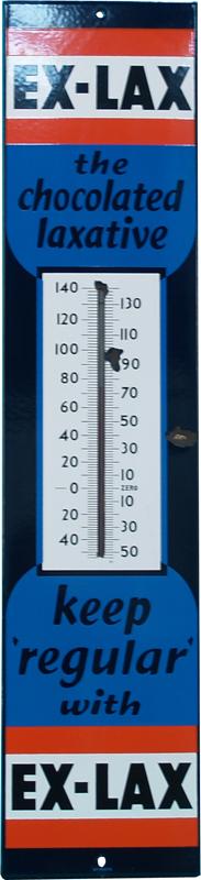 Ex-Lax Porcelain Sign w/ Thermometer, "The Chocolate Laxative - Keep Regular With..." - 8" x 36"