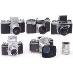 € 110,- 1) Ihagee, Dresden, "Exakta Varex IIa", Nr. 884.103, um 1958, geprägte Frontplatte, mit Prismeneinsatz (2 Lederstücke), Zeiss Biotar 2/58 und Sonnenblende. - Embossed name plate, with prism finder, Biotar lens and hood. (3+/3) - 2) "Exa (0)", um 1958, geprägte Frontplatte, Trioplan 2,9/50, Tuben und Zwischenringe, mit Anleitung. - Embossed name plate, with extention tubes. (2/5) - 3) "Exa Ia", Domiplan 2,8/50, (3/3). - Und: 4) Kamera-Werkstätten, "Praktica FX", 1954, Meyer Primagon 4,5/35, (3+/3+). - Sowie: 5) "Praktica PL nova I", 1967, Enna Lithagon 3,5/35, (3/3+). - € 200/240 - (38/12)