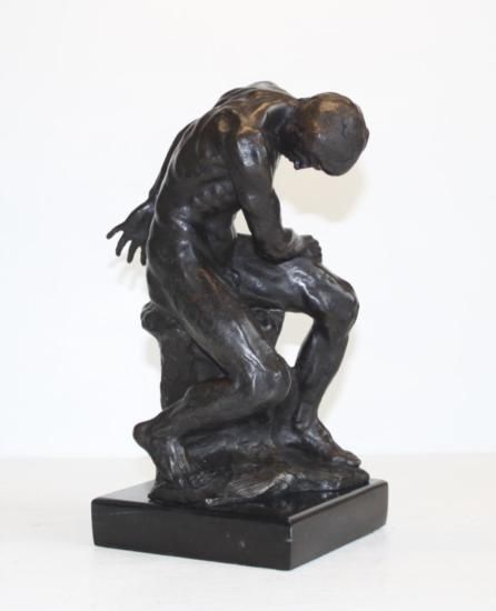 Exalted Thinker Pose, Bronze Sculpture, After Chiparus 10 1/2"H x 5"W x 5"D 13 lbs. This bronze sculpture was produced using the Lost Wax casting method. The Lost Wax Cast method is the most precise metal casting technique in existence, ensuring exquisite detail of the original host model which is usually sculpted in clay or wax. This Lost Wax casting method is an extremely labor intensive and expensive process, but the end results produce a Heirloom Quality Masterpiece!