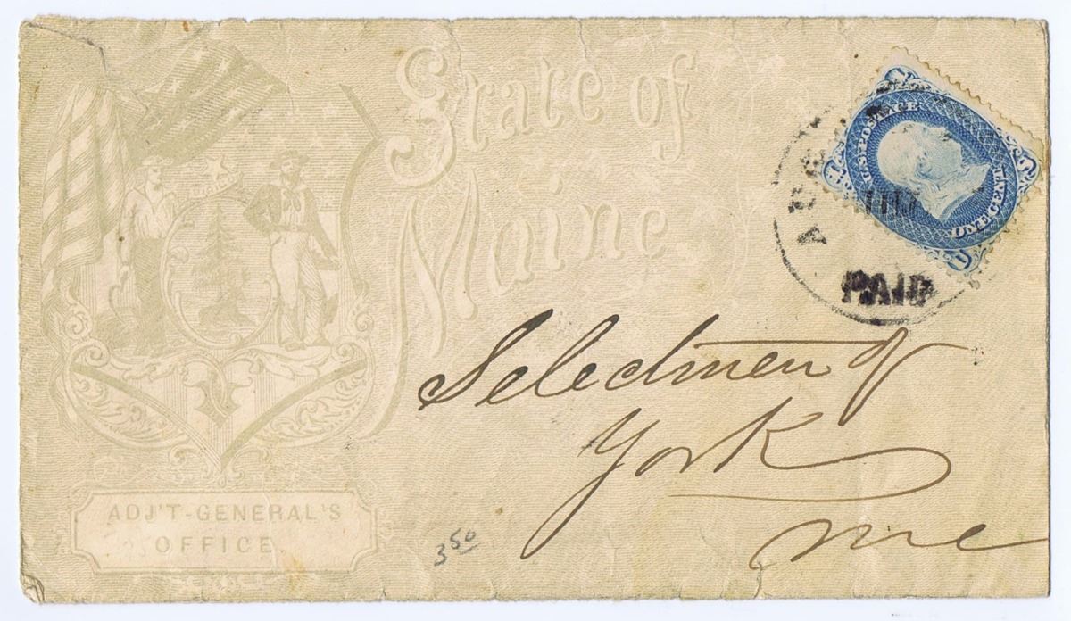 "State of Maine" design in palest moss, with oversize, detailed Seal and ornate typography. In frame below, "Adj't.-General's Office." To Selectmen of York. Scott #63, 1C/ blue Franklin, affixed at artistic angle, corner perfs just touching edge. Tied by "Augusta / Jul / Paid" c.d.s. Lacking flap, tears at upper left and top repaired inside with old hinges, left tip bent, some soiling, else good.