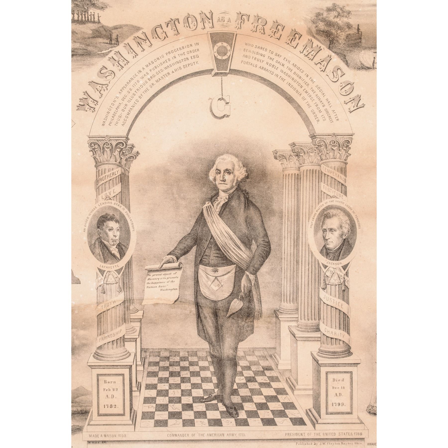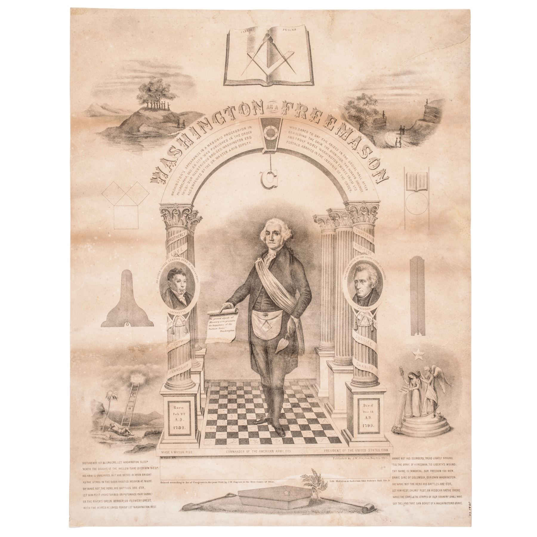 1852-Dated, Rare Original Decorative Lithographic Print titled, (George) “Washington As A Freemason” by “M. Mote, del., Published J.W. Clayton - Dayton Ohio. - Litho. Midleton & Anderson Odd Fellows Hall. Cin. O.”, Fine.