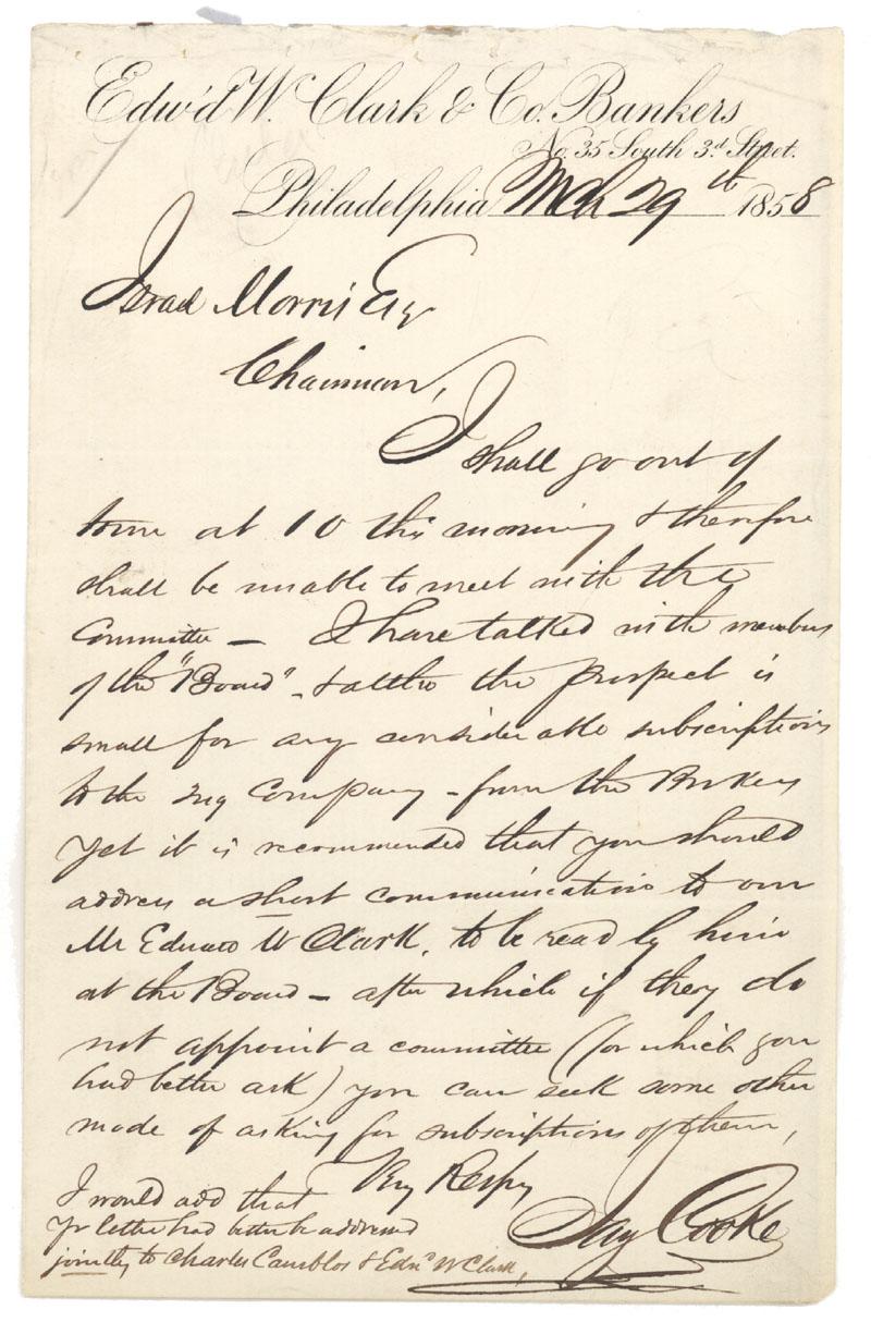 JAY COOKE (1821-1905) Railroad magnate and Financier. Autograph Letter Signed, “Jay Cooke,” on "Edward W. Clark & Co. Bankers” letterhead. Philadelphia, March 29, 1858. 1pp. 5" x 8'. The Banking House of E. W. dark & Company employed the rising star and future legendary magnate from 1836 to 1857. To Israel Morris, Esqr. Cooke writes: “Chairman, I shall go out of town at 10 this morning therefore shall be unable to meet with the Committee -1 have talked with members of the 'Board' - & altho the prospect is small for any considerable subscriptions to the [illegible] company -from the Bankers yet it is recommended that you should address a short communication to our Mr. Edward WClark, to be read by him at the Board - after which if they do not appoint a committee (for which you had better ask) you can seek some other mode of asking for subscriptions of them Very Respy. Jay Cooke I would add that yr letter had better be addressed jointly to Charles Camblor & Edwd W. Clark” At the young age of 18, the industrious Cooke entered the Philadelphia private banking house of E.W. Clark & Company. Within three years he became a member and before he was 30, he was also a partner in their New York and St. Louis branches. During the Panic of 1857, the firm failed, forcing Cooke to look for other employment of which was occurring when he wrote this letter. He opened his own banking firm. Jay Cooke & Co. in 1861 and was credited with issuing government bonds for financing the Civil War, raising over $2,000,000 in that year. Lightly creased at upper blank edge, tiny chip at lower right comer, otherwise Fine.