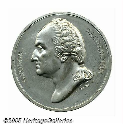 <B>Exceedingly Rare Trial Strike of the George Washington "Wright & Bale" Medal Struck in White Metal</B></I> Circa 1834 Washington, "Wright & Bale" medal, trial strike in white metal, Baker 75C. Choice near mint state. 45 mm. The obverse having a bust right portrait of Washington, "GEORGE" at left, "WASHINGTON" at right. The reverse being blank, with thick high rims. The dies engraved by Wright & Bale, whose imprint appears faintly on the lower right obverse. Bright and clean, with ample areas of original brilliant mint luster and only a few, minor handling marks. A fabulous George Washington medal rarity and a certain to become an important highlight for any major early American medal or George Washington collection. Lot:255