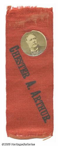 <B>Exceedingly Rare and Important Chester A. Arthur Ribbon</B></I> Arthur is one of the very toughest U.S. Presidents for whom to find campaign items. He assumed office upon President James Garfield's assassination in 1881, but was an unpopular President who had little support for the nomination in 1884. We can recall seeing only one other Arthur portrait ribbon in over thirty years in the hobby! This is a typical 1880s style ribbon, with paper photo attached. Very minor light "aging" to the ribbon itself is noted for strict accuracy, but this item is in excellent condition. If not a once-in-a-lifetime opportunity, it has to be very close! Length 5". Lot:259
