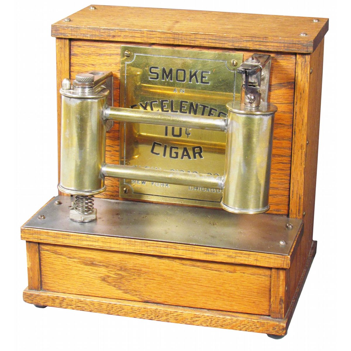 Excelentes 10 Cent Cigar Lighter & Cutter. Klein Cigar Co. New York and Chicago. Oak and brass. Very good original condition. 7 1/2 X 7 1/2 X 6 inches.