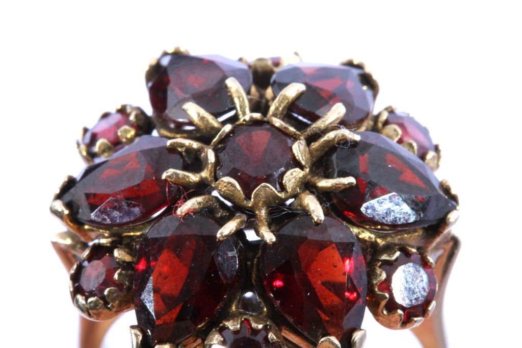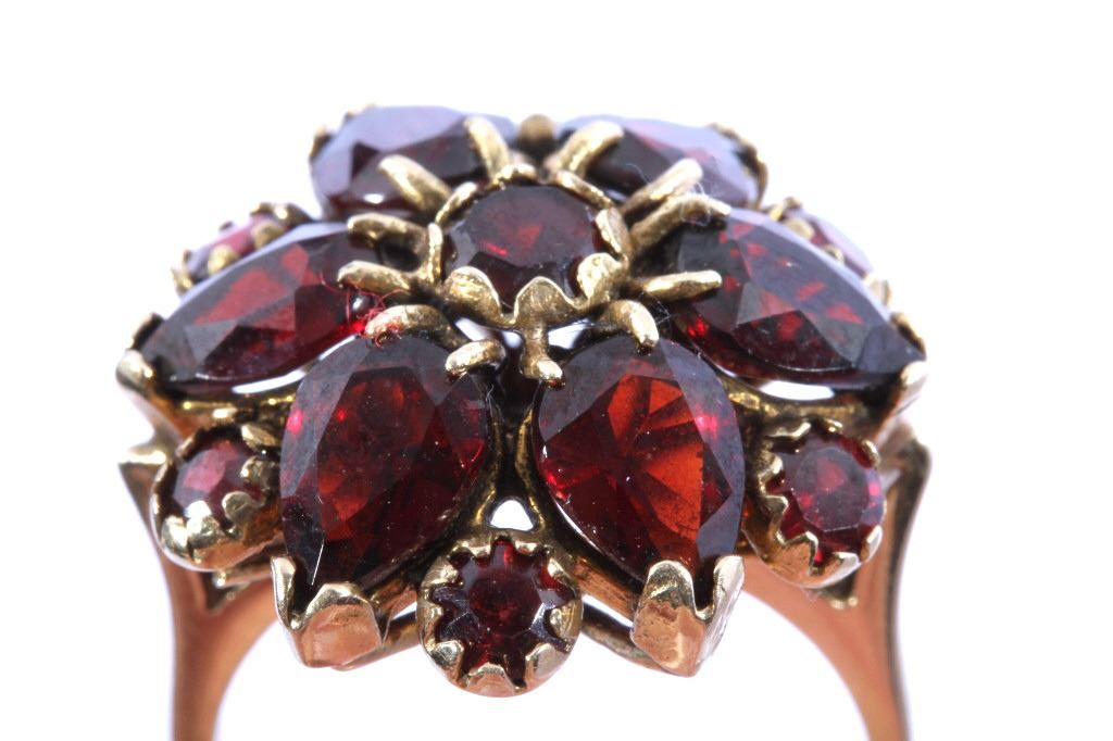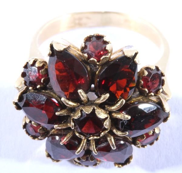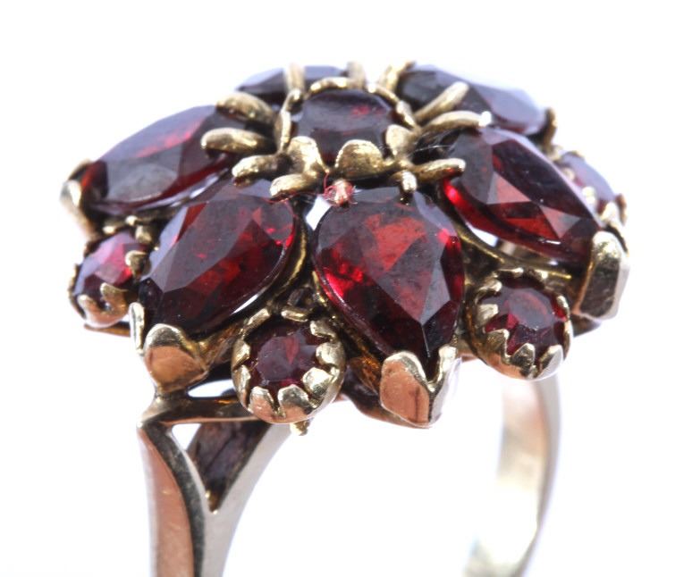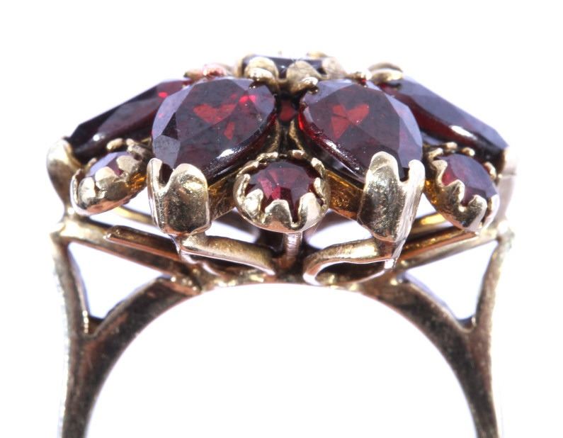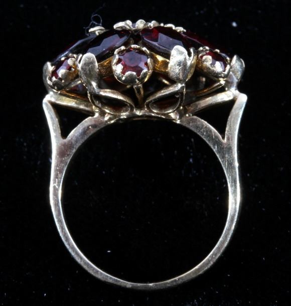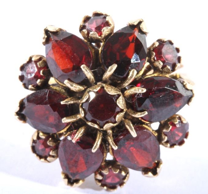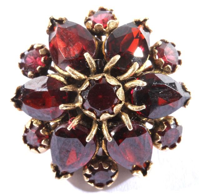 This is an early 10k yellow gold cocktail ring with a wonderful Red Garnet cluster setting. The ring shows a round brilliant center stone surrounded by six pear cut with six round brilliants on the outer edge. The ring is not hallmarked, but is 10k gold. Ring is a size 5.5.