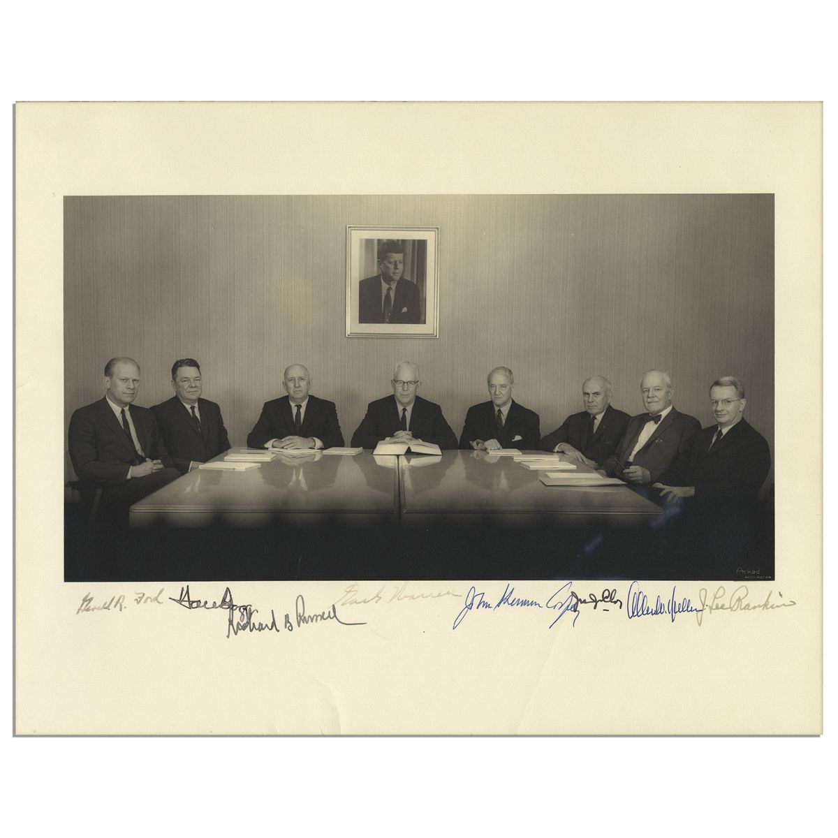 Signed photo display of the 1963 Warren Commission, enacted by President Lyndon B. Johnson in the wake of JFK's tragic assassination. Matte photo depicts each of the men in the commission posing at a table with a portrait of JFK hanging on the wall in the background. Signatures along the mat read from left to right: ''Gerald R. Ford'', ''Hale Boggs'', ''Richard B Russell'', ''Earl Warren'', ''John Sherman Cooper'', ''John McCloy'', ''Allen Dulles'' and ''J. Lee Rankin'', in blue and black ink. Measures 13.75'' x 11''. Mounted to board, otherwise near fine condition.