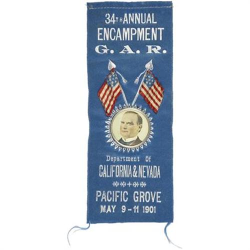 <B>Excellent 1901 William McKinley Ribbon from California & Nevada</B></I>. A lovely piece in fine condition from the "<I>34th ANNUAL/ ENCAMPMENT/ G.A.R."</B></I> Length: 2" x 6.5".<BR><BR><b>Shipping:</b> Flat Material, Small (<a target="_blank" href="http://www.heritageauctions.com/common/shipping.php">view shipping information</a>)
