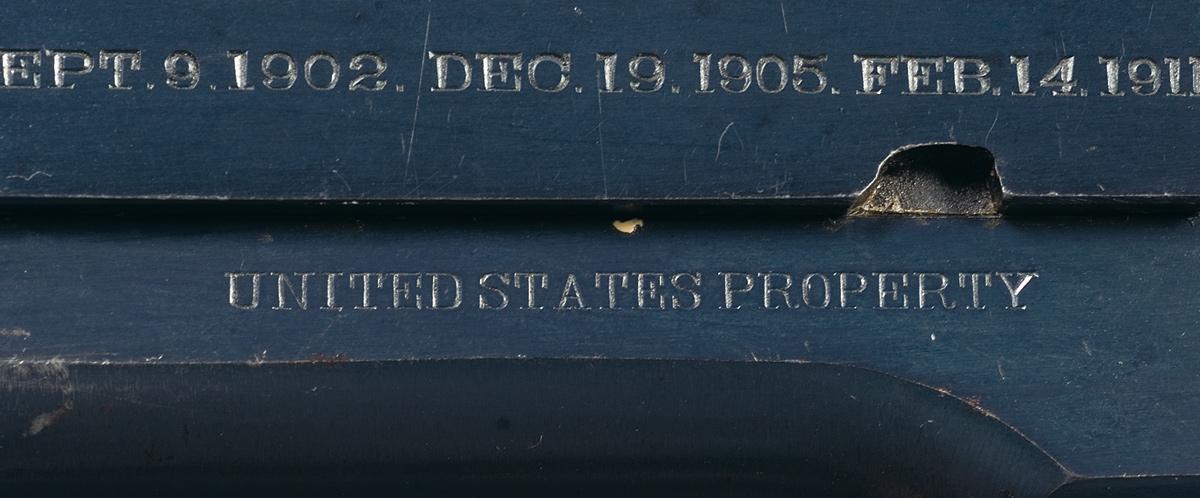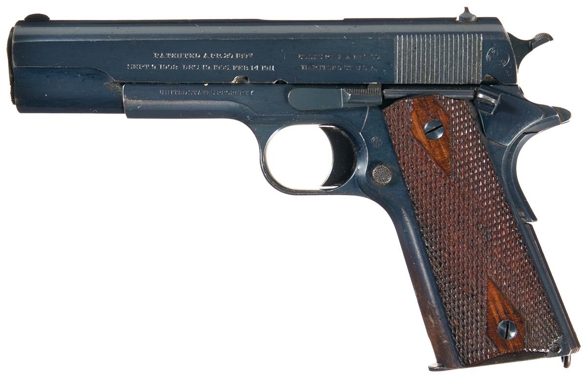 Manufactured in 1912. The left side of the slide is marked in two line blocks "PATENTED APR. 20,1897 / SEPT. 9, 1902, DEC. 19, 1905, FEB.14, 1911" and "COLT'S PT. F. A. MFG. CO. / HARTFORD, CT. U.S.A." with the Rampant Colt behind the serrations. Correct rounded rear sight with corresponding thin blade front sight. The left side of the frame is marked "UNITED STATES PROPERTY" and with the "WGP" inspection mark, the right side of the frame is marked with the serial number and "MODEL OF 1911 U.S. ARMY" on the left side of the slide. Checkered slide stop, thumb safety, magazine release and hammer spur with a smooth trigger and backstrap. Blue barrel and unmarked, later production replacement magazine, and fitted with checkered walnut grips with diamond pattern around the screws.