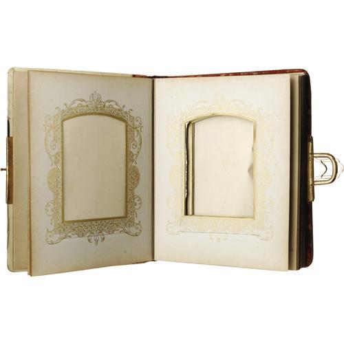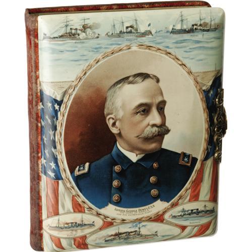 <B>Excellent Admiral Dewey Cabinet Card Photo Album (circa 1900)</B></I> with a fabulous and colorful lithographed celluloid cover. This padded photo album was made to hold 28 cabinet card sized photos and is 8.5" x 10.5" x 2.5" in overall dimensions. The front cover features a handsome portrait of Dewey in uniform in an oval with a foliated border against a dual flag background. The caption reads "Admiral George Dewey, U.S.N. The Hero of Manila and his Victorious Fleet" and the following ships are pictured above and below: <I>Boston, Concord, Petrel, Raleigh, Olympia,>Q and <I>Baltimore.</B></I> Dewey, of course, had been on the USS <I>Olympia</B></I> where he gave that famous command on the morning of May 1, 1898 at Manila Bay, "You may fire when you are ready, Gridley." The battle lasted a scant six hours; he captured or sunk the entire Spanish Pacific fleet without a loss of an American life. He arrived home to a hero's welcome and was made Admiral of the Navy by an act of Congress in 1899, the only person ever to hold that rank. This is just one of the many souvenir items manufactured at the time in his honor. You will likely not find a nicer one of these albums anywhere. There is some wear to the patterned velvet spine and back cover but the front cover is still bright and intact, the clasp is present and functioning, and the photo pages are clean- just waiting for your collection of period cabinet cards to be inserted.