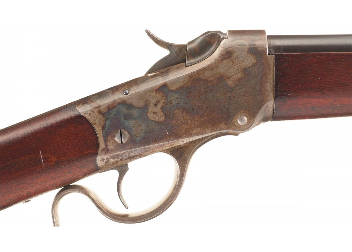 The included Winchester letter confirms the rifle configuration, caliber, #1 round barrel, 24 inch barrel and plain trigger. The rifle was received in the warehouse on February 8, 1893 and shipped on order number 17513 on July 24, 1894. The rifle is equipped with a blade front sight and a buckhorn rear sight on a barrel marked with the two line address ahead of the rear sight and "22 SHORT" at the breech. The serial number and 1879 patent date are stamped on the lower tang. Blue barrel with the remaining metal surfaces casehardened. Smooth forearm with ebony forend insert and straight grip stock with crescent buttplate.