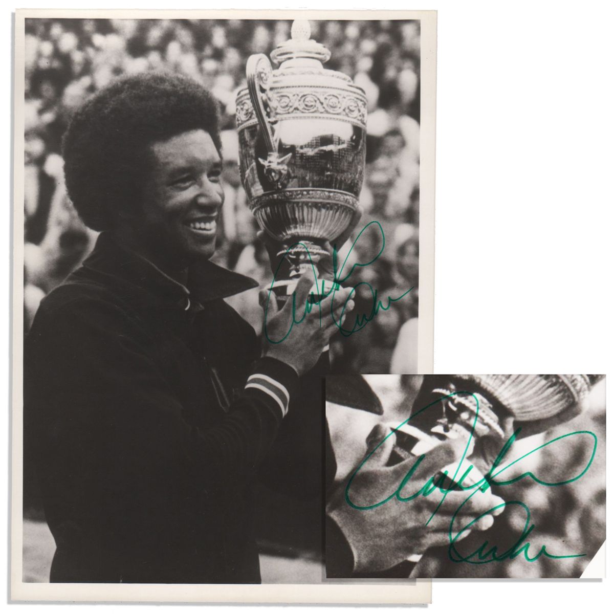 Arthur Ashe signed photo, depicting the tennis legend beaming and holding his Wimbledon trophy at that historic championship. Black-and-white glossy photo is signed ''Arthur Ashe'' in green ink near the trophy base. Measures 5'' x 7'' and is in near fine condition. With an LOA from Ashe's widow.