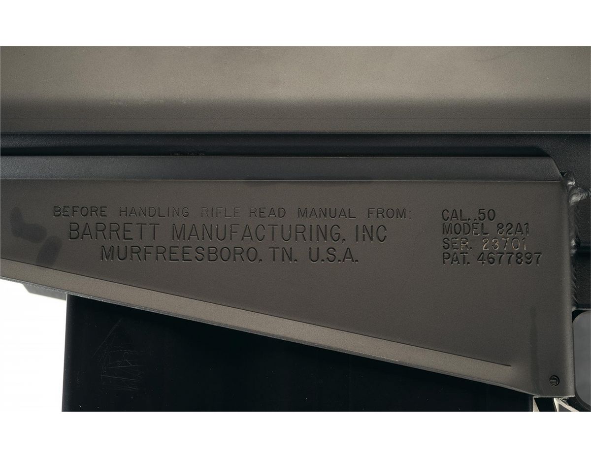 Developed in the early 1980's the M82 series of weapons has been adopted by a number of military forces, where it's long range striking power makes it useful for disabling vehicles, detonating enemy ordnance as well as sniping at extended ranges. The M82A1, adopted by the U.S. Marine Corps as the M82A3 Special Application Scoped Rifle, is the latest in the series. This version features a spring loaded folding blade front sight and a folding peep rear sight that are integrated into the 23 3/4 inch top-mounted Picatinny rail, with a detachable carry handle and a Barrett-marked Swarovski 10x42 scope. The barrel is fitted with the Barret Manufacturing muzzle brake, mounted on the fluted barrel, folding metal bipod, AR-15 style grip and safety, and a rubber padded buttstock with "club foot" style hand rest. Complete with a Pelican 1750 hard case, containing an extra magazine, scope box, detachable monopod and a cleaning kit.