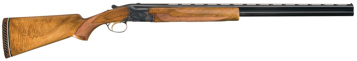 Manufactured in Belgium. Dual ivory sights on a matte vent rib, 2 3/4" chambers, chokes marked skeet and skeet. The receiver, trigger guard, tangs and barrel lever feature light scroll engraving. Gold washed single selective trigger with "Lightning/ BROWNING" marked on the bottom of the receiver along with the small bust of John M. Browning in the center. High luster checkered forearm and pistol grip stock with vented Browning recoil pad. Length of pull is 14 1/4".