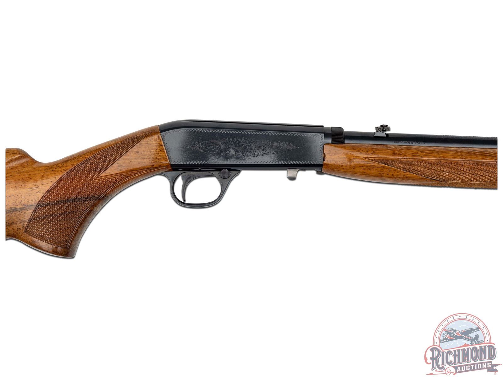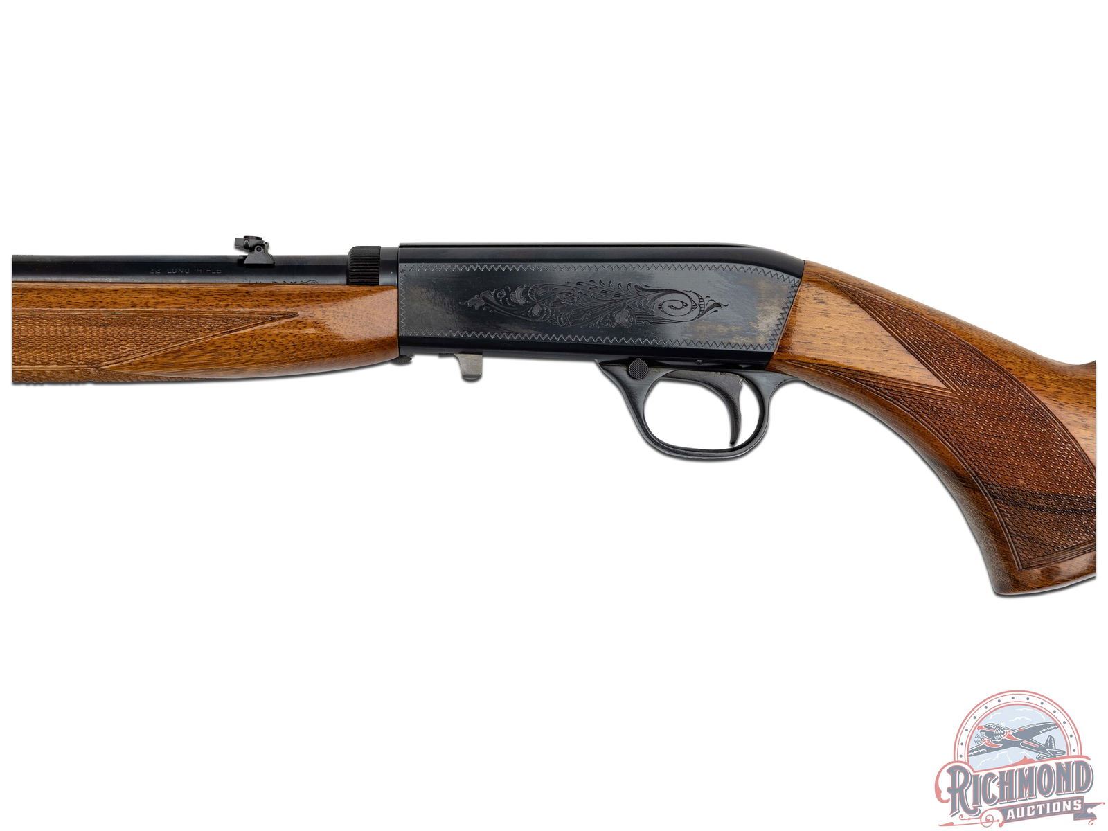 Manufactured in 1956 in Belgium by FN for Browning. Blued round 19-3/8" barrel with hunting sights and Browning logo on barrel. Blued floral engraved takedown receiver. Blued trigger with push button safety and tubular magazine. Walnut plain checkered stocks with blued serrated butt plate. This would be a difficult example to improve upon. CALIBER: 22 LR. S/N: 11442. FFL STATUS: Curio & Relic.