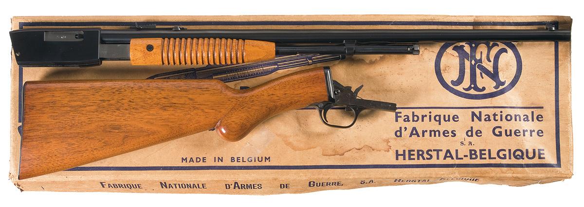 Manufactured in Belgium from 1922 to 1974. Features dovetailed blade front sight and adjustable v-notch rear sights on a barrel marked "FABRIQUE NATIONALE D'ARMES DE GUERRE-HERSTAL-BELGIQUE/BROWNINGS PATENT DEPOSE", with the caliber marked on the left side near the breech. 15 groove rounded forearm and smooth round knob pistol grip stock. Complete with the correct factory box.