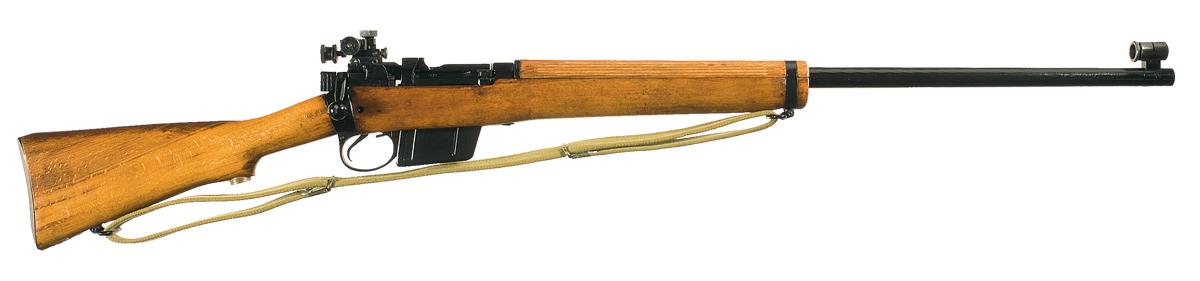 This is a very nice example of a WWII No4 MKI British Enfield bolt action rifle that was converted in the 1950/1960s to a commercial target rifle in 7.62MM NATO. These rifles were the standard rifle that was used in all British service rifle matches. The conversion process started with a basic WWII No.4 rifle that was completely disassembled and rebuilt starting with a new heavy, target weight barrel, commercial style free floating forend and hand guard along with a new Parker Hale PH 5E-4 target rear and target globe front sight. The conversion from .303 British to 7.62 NATO consisted of a new bolt head, proof for the 7.62 round along with a new magazine box and barrel as noted above. The side of the receiver is marked "7.62M/M L39A1/UE 72 A1200". It is fitted with a new hardwood stock and handguard set and is complete with a military green canvas sling and a set of extra front sight inserts in a brass PH storage box that is inletted into the under side of the buttstock.