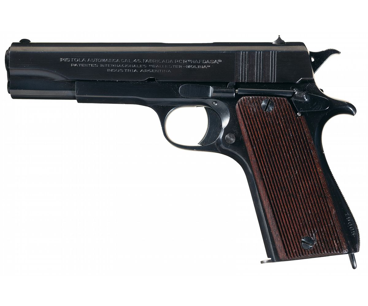 Produced in Argentina, the Ballester-Molina was the successor to the Model 1927 Pistol, a licensed copy of the American Colt 1911. The "B" prefix of the serial number and the British proofs are associated with a series of pistols produced expressly for sale to the British government during the Second World War, and was used as sidearms by the British 8th Army, as well as a number reportedly shunted to the Special Operations Executive, which was in need of non-British ordnance to equip their agents. Fixed sights, with the left side of the slide marked "PISTOLA AUTOMATICA CAL. 45. FABRICADA PCR HAFDASA/PATENTES INTERNACIONALES BALLESTER-MOLINA/INDUSTRIA ARGENTINA", and "crown/GP" proofs on the right side of the slide and frame, and Nitro proof/tonnage markings on the chamber. Fitted with ribbed grips.