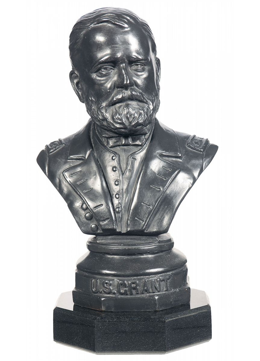 Made by German/Confederate artist Frederick Volck (1833-1891). Volck, a native of Nuremberg, Germany who immigrated to Richmond, VA, and was employed in the Confederate Naval Ordnance Dept. during the Civil War. The bust was sculptured in 1869 after the Civil War and when General Grant became President Grant. The state of Virginia as well as Frederick Volck were grateful for the way that General Lee was treated by General Grant at Appomattox. The bust is a symbol of that appreciation and was presented to President Grant during one of General Lee's trips to Washington to talk with the President after the war. The bronze rests on a 2 inch black octagon marble base and weighs approximately 50 lbs. The front of the bronze is marked "U.S. GRANT" in block letters and the back of the bronze is inscribed "U.S. PRESIDENT/FREDERICK VOLCK/1869/RICHMOND,VIRGINIA". Measuring 19 inches high, 10 3/4 inches wide, and 6 1/2 inches deep.