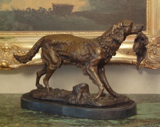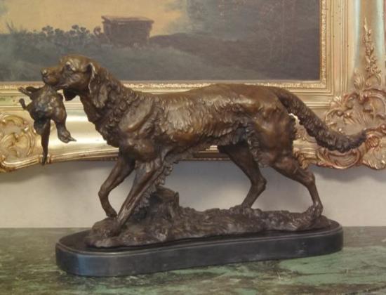 Hunting Dog with Quail Bronze Sculpture, 12 "H x 18"W x 7"D28 lbs. This bronze sculpture was produced using the "Lost Wax" casting method. The"Lost Wax" Cast method is the most precise metal casting technique in existence, ensuring exquisite detail of the original host model which is usually sculpted in clay or wax. This "Lost Wax" casting method is an extremely labor intensive and expensive process, but the end results produce a Heirloom Quality Masterpiece!