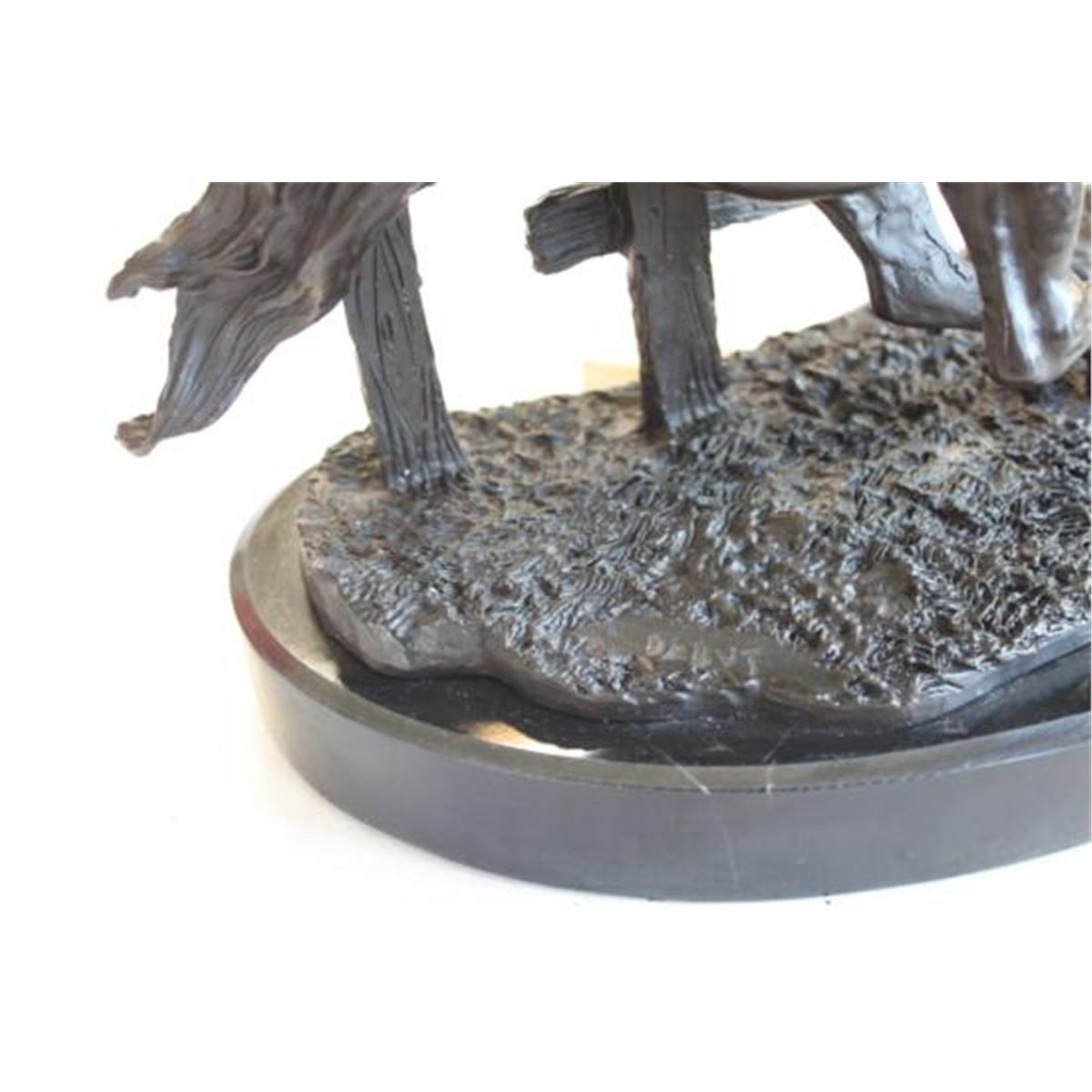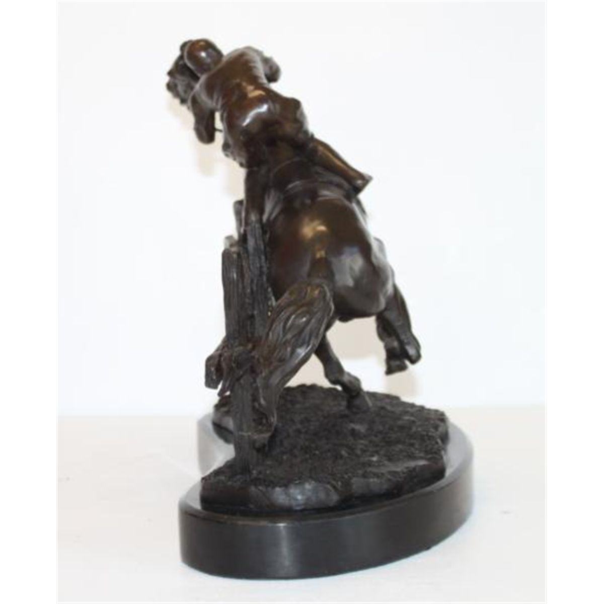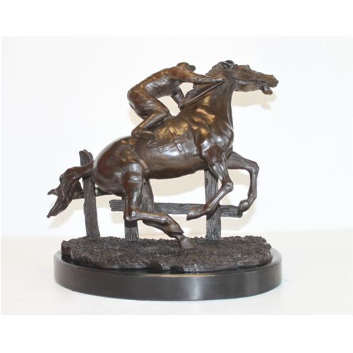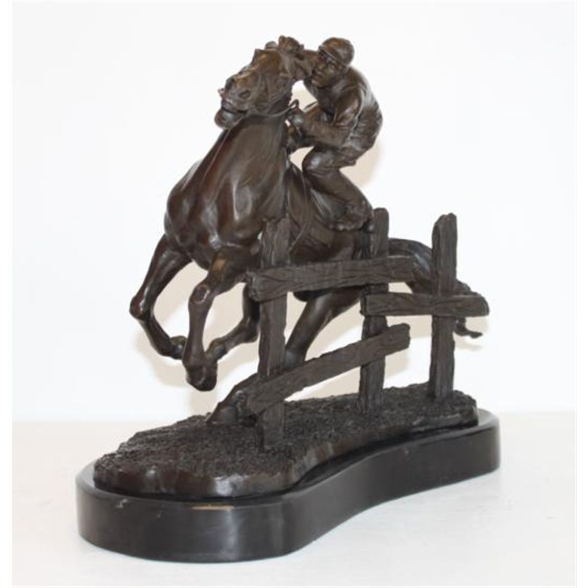 Steeplechase Bronze Sculpture, After Debvt, 13"H x 11"L x 7"D 23 lbs. This bronze sculpture was produced using the "Lost Wax" casting method. The"Lost Wax" Cast method is the most precise metal casting technique in existence, ensuring exquisite detail of the original host model which is usually sculpted in clay or wax. This "Lost Wax" casting method is an extremely labor intensive and expensive process, but the end results produce a Heirloom Quality Masterpiece!