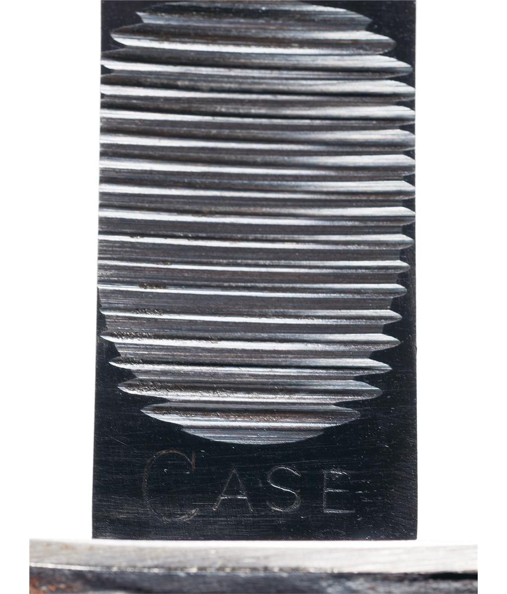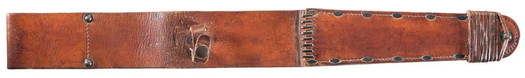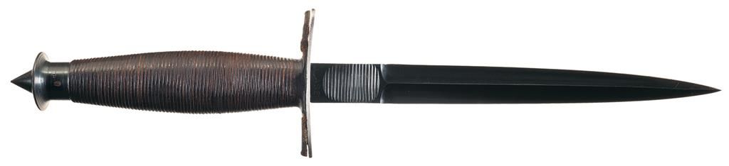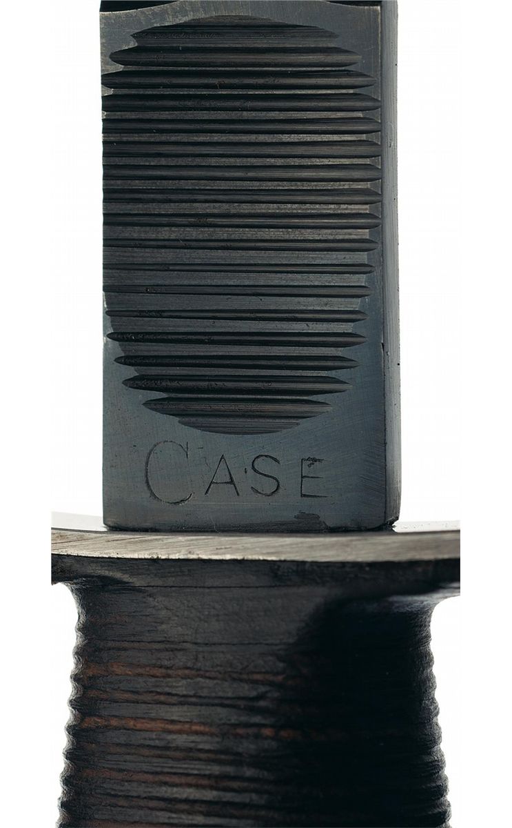 Originally manufactured for issue to the 1st Special Service Force and seeing service with the Marine Raiders. Notes from the consignor state that this knife was an original Case V-42 that was returned to Army inventory following World War II and was broken out of storage for issue to the freshly reactivated Ranger companies that were preparing to deploy for the Korean War. This particular knife is reported as being issued to one Nick Nakajo; research identifies a Masahiro Nakajo in the 3rd Ranger Company in Korea, a young Japanese-American who had been recruited into the Army out of the Manzanar Relocation Camp. When the consignor became acquainted with Nakajo in the 1970s, he was a Lieutenant Colonel involved with the development of the Apache Helicopter. Nakajo recalled that the knife was not issued to him until the very end of Ranger training, by which time he had privately purchased a Randall #1, and so the V-42 spent the war in storage. Arriving in Korea in 1951, the 3rd operated as a reconnaissance and 'spearhead' unit for the 3rd Infantry Division, exploiting the relatively fluid front lines to infiltrate into enemy territory. By the time the 3rd Rangers and the other Ranger companies were consolidated into the U.S. 187th Airborne Regimental Combat Team, the 3rd had suffered over 50% casualties in combat with the North Koreans. The stiletto measures 12 3/4 inches overall, with a 7 3/8 inch double edged blade, showing extra sharp hollow ground edged and the distinctive long ricasso with the serrated thumb rest over "CASE" on one side, an oval cross guard with leather padding on the underside, ribbed leather washer grip, and the flared steel pommel with "skull crusher" spike on the bottom. With the original "long drop" leather sheath, 20 inches long with staple reinforced throat and stitching.