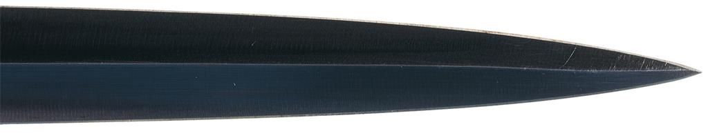 Excellent, with over 90% of the original blue finish, showing some light wear on the blade concentrated towards the tip and some minor scratches. The guard is bright and the pommel shows mild spotting. A few cuts are present in the guard padding, with light handling marks on the grip. The holster is very good with some cracking on the retention strap, surface wear on the hanger and mild verdigris at the bottom. V-42 rigs are scarce in any condition; the stilettos typically suffered very hard use, and the sheaths were often discarded or altered to a more conventional profile, leaving very few this fine available today.