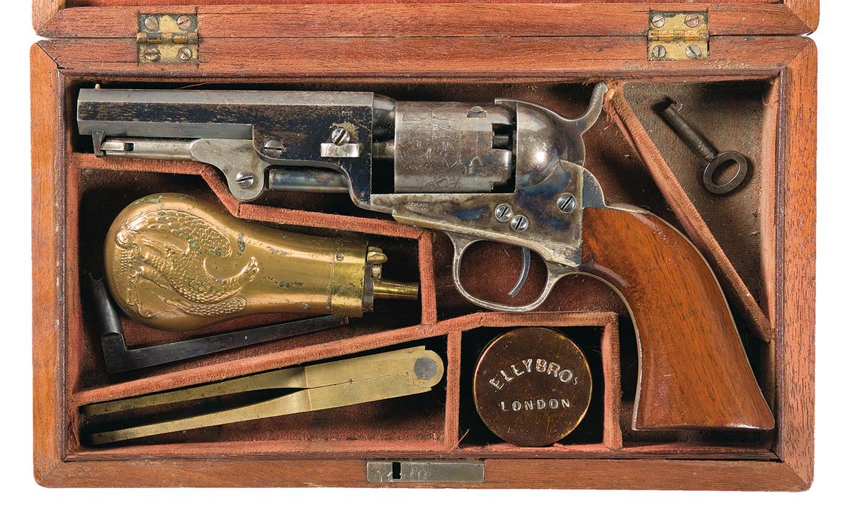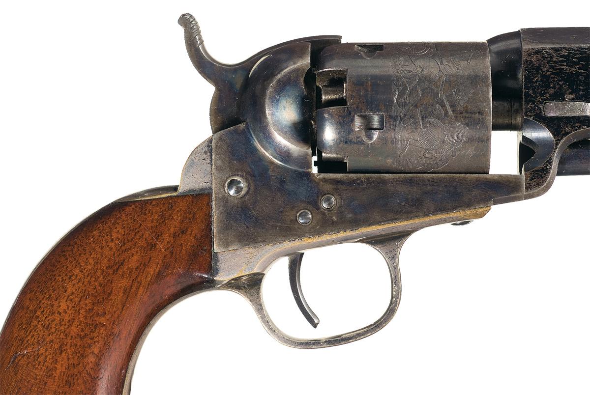 Condition: Excellent. The barrel retains approximately 90% of the bright original high polished blue finish. The cylinder retains approximately 70% of the original finish with the balance having a smooth gray patina. The cylinder scene remains strong as well as the other markings. The trigger retains almost all of the original blue finish. The frame and hammer retain almost 95% of the original bright case colors. The trigger guard and backstrap retain 95% of the original silver plating with edge wear and some thinning. The exposed brass has an aged patina. The grips are near mint with 99% of the original varnish and light handling marks and minor edge wear where the grip has rubbed in the case. All markings are clear. Mechanically excellent. The case is very fine overall. The top of the lid is separated from the side along the back and there are scattered minor scratches and dings. The lining is faded and shows some wear where the hammer, grip edge and cylinder come in contact with the lining. The accessories are all very good. An exceptionally nice Model 1849 Pocket Revolver with case and accessories.