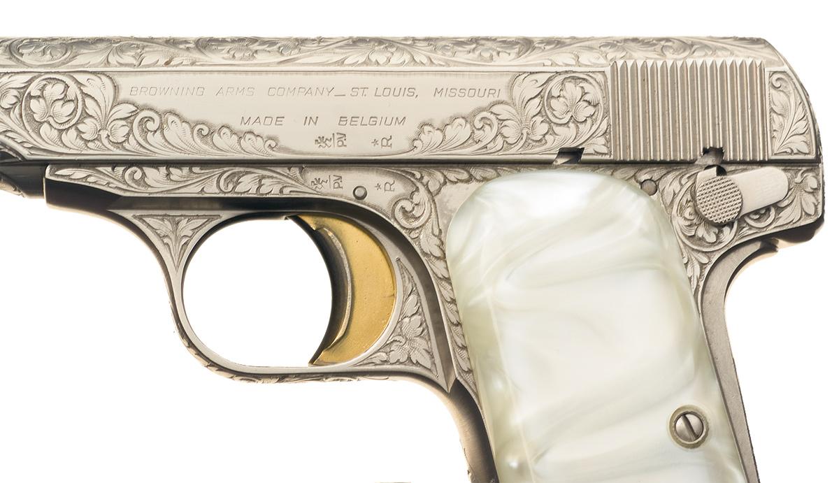 Manufactured by Fabrique Nationale in Herstal, Belgium. The pistol shows renaissance style floral scroll engraving covering approximately 90% of the gun, and features a gold washed trigger. Belgian proofmarks are on the barrel and slide. The Browning St. Louis address is on the left side of the slide over "MADE IN BELGIUM". Fitted with smooth simulated pearl grips. Complete in a blue leatherette case with a blue velvet interior.
