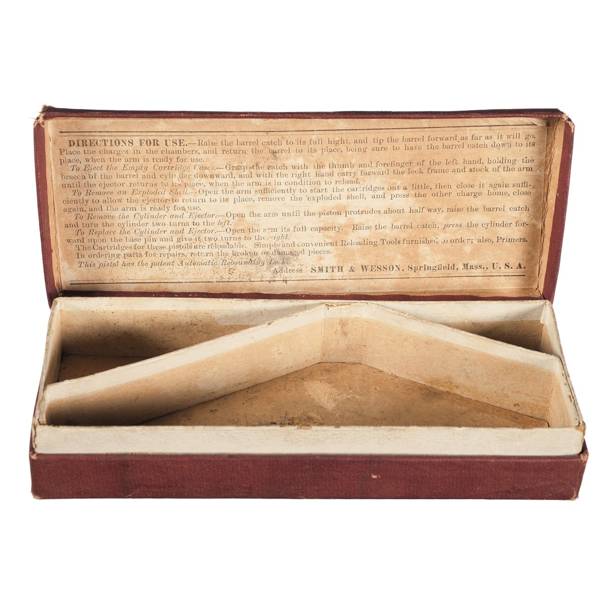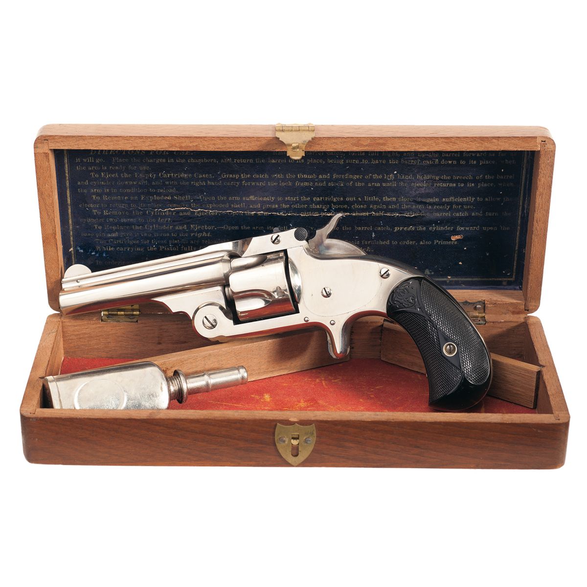 Manufactured between 1878 to 1892. The top of the barrel rib is marked with the two line address/patent dates, with additional patent dates on the top strap and the matching serial number is marked on the butt, rear face of the cylinder, barrel and barrel latch. Blade front sight with notched rear sight. Tip-up frame with spur trigger and 5-shot fluted cylinder. Nickel finish, with blue barrel latch, casehardened hammer and fitted with checkered hard rubber grips with "S&W" logo at the top and patent date marking on the left side toe. Complete with a Smith & Wesson factory wooden case with three compartments, dark blue S&W instructions label on the inside of the lid and oiler. Also comes with an original brown hinged lid box with white instructions label on the inside of the lid and three compartment.