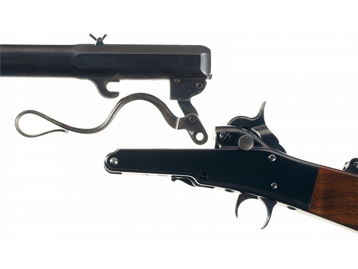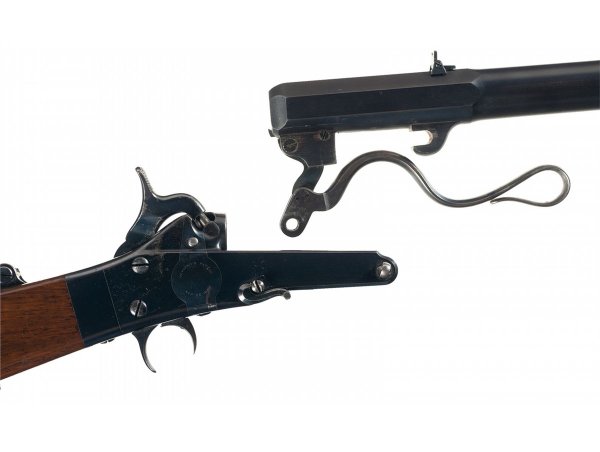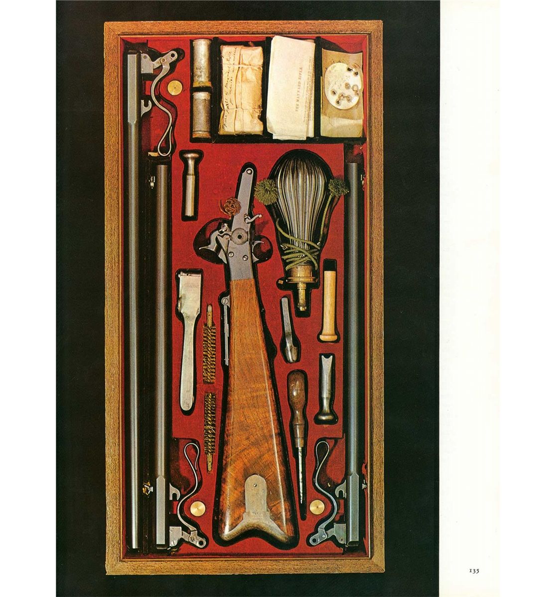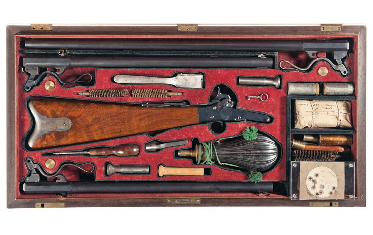 Condition: Excellent. The 50 caliber barrel retains 97% original blue finish showing some mild thinning. The lever retains 70% original case colors. The 40 caliber barrel retains 95% thinning original blue finish with minor pitting on the lever. The shotgun barrel retains nearly 97% thinning original blue finish with a few small patches of light spotting. The lever retains 97% plus original case colors. The receiver and hammer retain 97% original blue finish showing some minor high edge and spot wear. The patch box and buttplate retain 50% original blue finish with the balance a smooth gray patina. There are a few patches of minor pitting. The highly figured deluxe burl walnut buttstock is also excellent with some scattered minor handling marks. Mechanically excellent. The case is very fine with some minor handling/storage wear and wear on the lining from the high spots of the rifle.