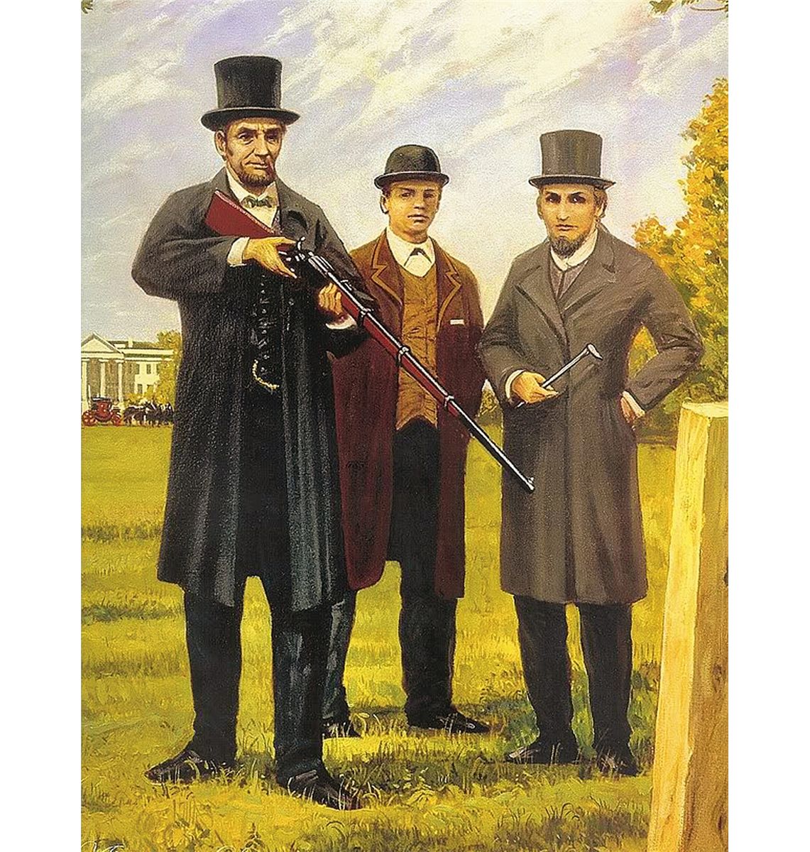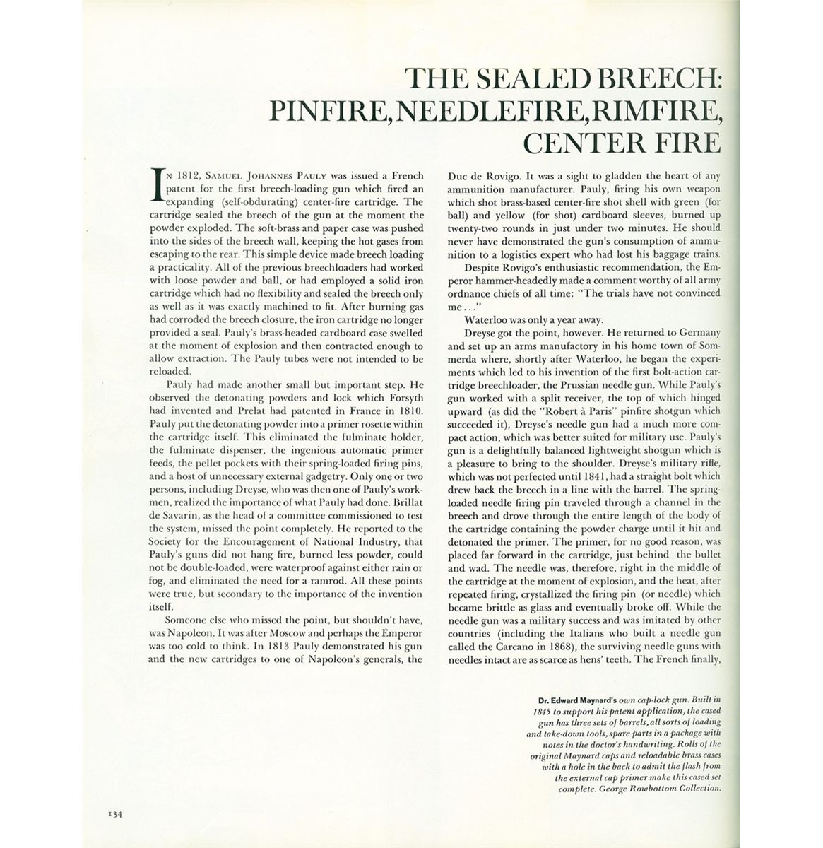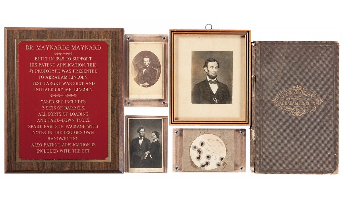 This is an excellent example of a cased Maynard single shot percussion longarm with two rifle barrels, one shotgun barrel, and accessories. Included with the longarm is a 3 inch x 3 1/2 inch target signed with the initials "AL" and marked in pencil "10 Rds/[illegible]/20 in 4/10". It has been reported that the "AL" initials are that of Abraham Lincoln and that the 16th President of the United States fired this longarm. It is known that during the Civil War President Lincoln encouraged weapons development and even test fired longarms himself on an open area south of the White House. Lincoln promoted a wide range of military technologies which included rifles, body armor, gunpowder, shells, field artillery, and ironclad naval warships. His interest in military technology proved vital to the Union's weapons development efforts. For instance, he was instrumental in the development of the mortar boat which helped clear the Mississippi River and backed the development of John Ericsson's plan for turreted ironclad warships which helped the Union maintain its dominance at sea. Lincoln is known to have watched naval gun testing at the navy yard on the Anacostia River and watched the testing of the Parrott rifled artillery at Cold Spring Armory. At times, Lincoln would even function as chief of ordnance, testing new weapons himself. Lincoln test fired the "coffee-mill gun", an early hand-cranked machine gun and practiced his long distance skills with sharpshooters at a Union camp which resulted in Lincoln ordering breech loaders for the regiment. Perhaps Lincoln's most famous testing of military hardware came on August 18, 1863 when he personally test fired the Spencer seven shot rifle on the White House lawn at a distance of forty yards. The President made seven consecutive shots. Prior to firing the rifle, Lincoln was skeptical of the effectiveness and reliability of the Spencer. The objective of the demonstration was the reversal of Lincoln's negative opinion concerning the rifle. Although the demonstration resulted in good will towards the Spencer Company, there is no historical evidence to suggest that the demonstration promoted the purchase of the rifle. Presidential and Civil War historians have noted that it was common for inventors of rifles, artillery, and other weapons to invite President Lincoln to witness a trial or to send him a specimen. As historian Robert V. Bruce noted, "Consider how easily an assassin reckless of his own life might have entered Lincoln's office with a repeating rifle or a bomb. Many men did just that, although none, luckily, with murder in their hearts. 'On my arrival to the White House,' one inventor remarked matter-of-factly, 'I was ushered immediately into the reception room, with my repeating rifle in my hand and there I found the President alone.' The well established historical record confirming Lincoln's interest in firearms make it plausible that this Maynard was fired by the 16th President of the United States. This Maynard is pictured in Merrill Lindsay's book ONE HUNDRED GREAT GUNS (page 135). The photograph shows the rifle in its case with three barrels, accessories, and the "AL" marked target, all of which are included in this lot. Lindsay identifies this longarm as "Dr. Edward Maynard's own cap-lock gun". Built in 1845 to support his patent application". The Maynard primer door on this longarm is marked "MAYNARD'S PATENT/SEP. 22, 1845". It is equipped with a tang peep sight. The rifle is mounted on a straight grip walnut stock with a crescent buttplate and iron patch box. The patch box is marked "MAYNARD PATENTEE/MAY 27, 1851/JUNE 17, 1856". The inside of the patch box has a series of patent dates printed on a paper insert. The patent marking is as follows "MAYNARD,/Patentee,/MAY 27, 1851, JUNE 17, 1856,/JAN. 11, 1859,/OCT'R 4, 1859,/OCT'R 4, 1859,/DEC'R 6, 1859." As stated, this Maynard longarm comes with three part octagon barrels. The first barrel is 20 inches long and chambered for 50 percussion caliber with a combination Beach front sight and two leaf rear sight with the leafs marked "10" and "20". The underside of the barrel at the breech is marked with the number "10908" and the letter "J". The second barrel is 20 inches long and chambered for 40 percussion caliber with a combination Beach front sight and two leaf rear sight with leafs marks "10" and "20". The underside of the barrel at the breech is marked with the number "3" and the letter "J". The third barrel is a 20 gauge shotgun barrel which is 26 inches long and has a bead front sight. All barrels are blue with the 40 caliber barrel having a blue lever and the shotgun and 50 caliber barrels having a casehardened lever. The nicely figured case has brass corner protectors, a blank initial oval on top of the lid and lined with red velvet. The following accessories are included: a two cavity (40 and 50 caliber) Maynard bullet mold, three bore brushes, an American Flask and Cap Co. powder flask, a Maynard tape primer container with tape primer, a Maynard lubricator container, a package of spare parts marked "Spare parts of Maynard Rifle/for repairs when needed," in Dr. Maynard's own handwriting, screwdriver, reloadable brass cases with a hole in the back to admit the flash from the external cap primer, wad cutter, two bullet starters, key, and 8 page Maynard rifle testimonials and instructions pamphlet. The following Lincoln related items are also included: a Mr. & Mrs. Lincoln illustrated portrait card, a Lincoln illustrated portrait card, a framed portrait of Lincoln (frame 6 1/2"x6 1/2"), and George Bancroft's MEMORIAL ADDRESS ON THE LIFE AND CHARACTER OF ABRAHAM LINCOLN (1866). Overall this gun set, as Lindsay concluded, "would make any gunner's mouth water" (page 157).