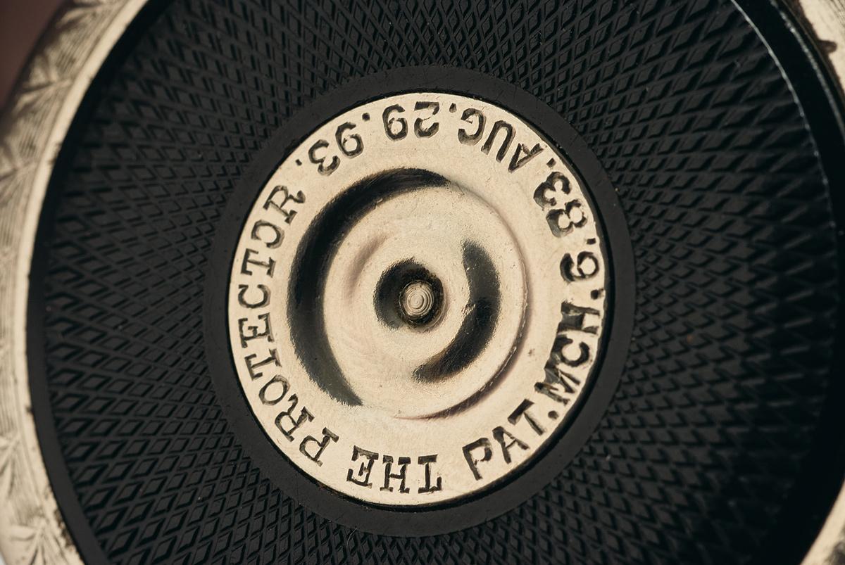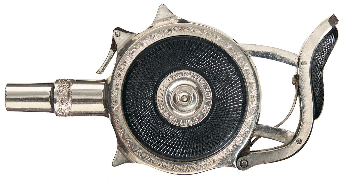 Featuring a barrel with a band of floral engraving, and the right side of the frame has a similar pattern around the edge, with "THE PROTECTOR/ PAT.MCH.6.83.AUG.29.93" in a circle on the side plate. The left side plate is checkered around the border with "CHICAGO FIRE ARMS CO./ CHICAGO, ILL" in a circle at the center, twists off to reveal the magazine, and is numbered to match other components. The rear trigger is fitted with a hard rubber grip, checkered with diamond patterns.