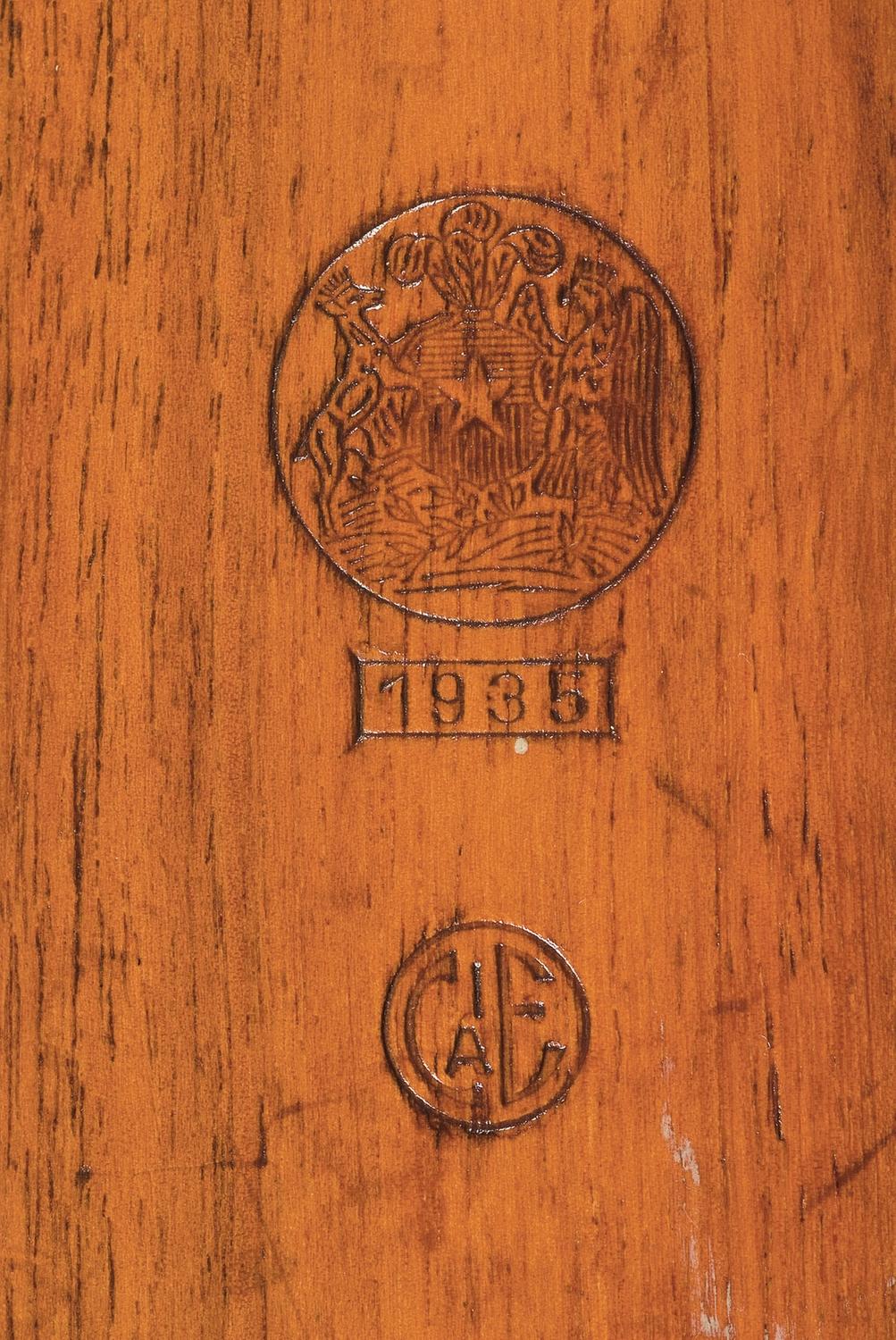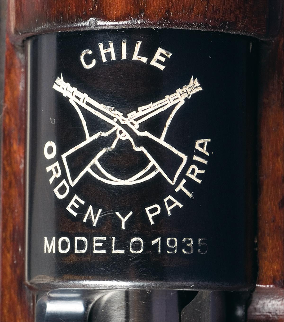This a very nice example of a pre-war Mauser rifle, these were produced prior to WWII under contract for the country of Chile. The top of the receiver has the Chilean "Crossed-Rifles" Crest, marked "CHILE" at the top and "ORDEN Y PATRIA" at the bottom and "MODELO 1935" below that and the rear receiver ring is marked with the "Mauser Banner" logo. The right side of the receiver is marked with the pre-war commercial proofs of a "Crown B, U, G and N" proofs. The receiver side wall is marked "MAUSER-WERKE A.G. OBERNDORF A/N" and the left side of the receiver ring is marked with a five pointed star followed by "Serie C. Ch. No 715". Shrouded front sight and tangent rear sight graduated to 1,400 meters. It has a walnut stock and long handguard that extends to the receiver ring, the left side of the stock has the large "Chilean Crest/ 1935/CaE" circular proof. It has both the bottom and side mounted factory sling swivels, milled components with blue parts with bright polished bolt assembly and is complete with an original leather sling and cleaning rod.