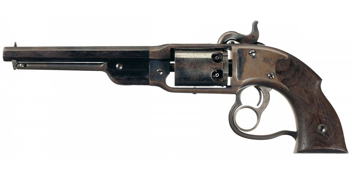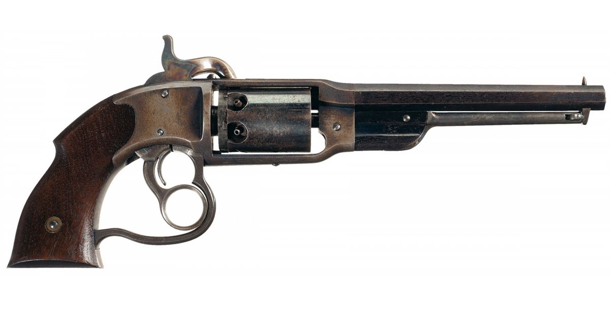 This unique revolver was manufactured from 1861 to 1865. These revolvers have a 7 inch octagon barrel and heart-shaped trigger guard. The barrel, loading lever, cylinder, and frame are blue. The guard, hammer, and triggers are casehardened. The grips are two piece oil-finished walnut with the left panel numbered to the gun. The frame top strap is marked "SAVAGE R.F.A. Co, MIDDLETOWN. CT./ H.S.NORTH PATENTED JUNE 17 1856/JANUARY 18 1859. MAY 15 1860". The unique action functions with a lever and a trigger. The lever has a loop for the middle finger. When the lever is pulled back the cylinder turns and the hammer is cocked, the lever is released and the trigger is pulled to fire the weapon.