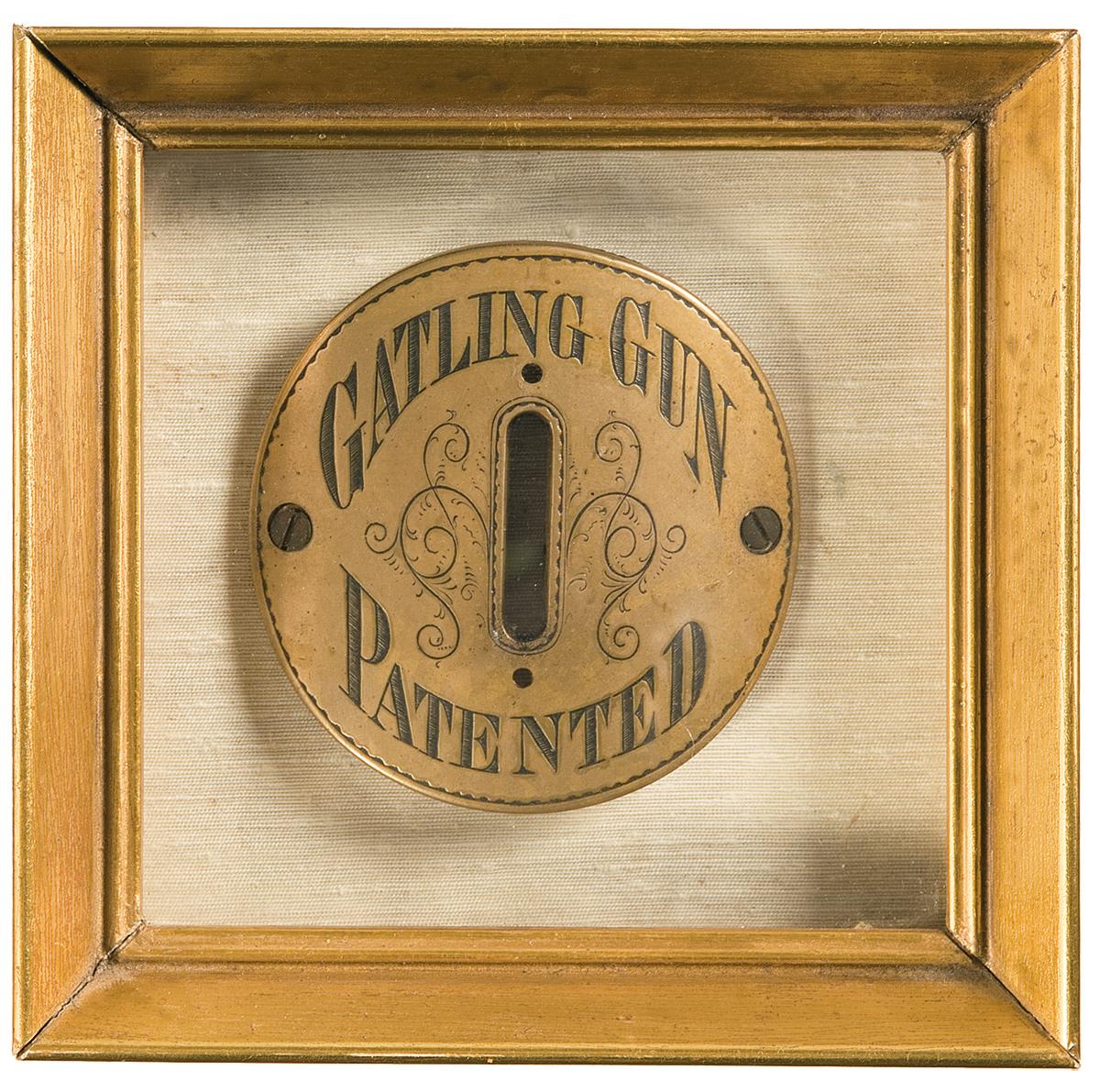 Displayed in a 6 3/8" square frame, the gatling gun plate is from a 1883 Colt Gatling Gun. Typically this plate would be affixed to the breech of the barrel housing and would house the spirit level. The spirit level was used in the sighting process. The plate measures 3 5/8" diameter and the entire edge is engraved. There is an oval hole in the center of the plate where the spirit level would rest, with two smaller holes above and below. On either side of the oval hole are engraved flourishes. In big block letters is "GATLING GUN / PATENTED", at the top and bottom of the plate, with larger screw holes on the outside edge.