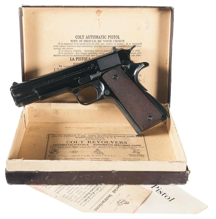 Manufactured in 1936. The pistol has the high polish Colt commercial blue finish and full checkered walnut grips. The barrel chamber is polished bright and the 10-shot magazine has a two-tone finish. The slide has a Partridge type target rear sight that is adjustable for windage and elevation and a fixed ramp front sight. The main spring housing is correctly not fitted with a lanyard loop. The right side of the slide is roll stamped: "COLT" followed by "ACE" in an diamond and ".22 LONG/RIFLE". The left side of the slide is roll stamped with the two-line elongated Colt Hartford address above the 1897-1913 patent dates and followed by the Rampant Colt trademark. The right side of the frame is roll stamped with the serial number "6145" behind the slide stop hole and the assembly mark, "60" on the trigger guard bow. The left side of the trigger guard bow is stamped with an "X" assembler's mark above the Colt "Triangle/VP" proof mark. The magazine floor plate is stamped: "COLT", "ACE" in a diamond and "22/LONG/RIFLE". Total production of the Colt Ace was 11,000 pistols manufactured between 1931 and 1941. The pistol is complete with the original royal blue cardboard carton. The pistol serial number "6145" is written in pencil on the bottom of the carton. The carton has a blue and white end label. Colt advertisements are stamped on the inside of the carton lid and bottom. The carton contains an original instruction sheet and a Colt "SPECIAL INSTRUCTIONS" pamphlet.