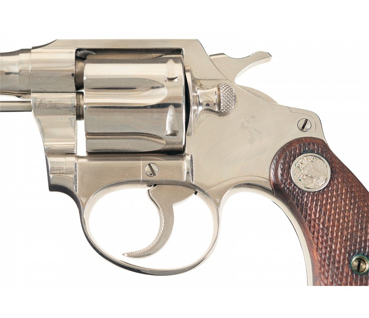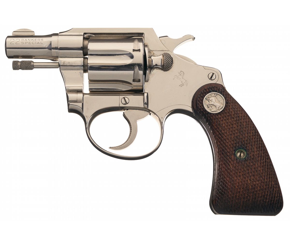 Manufactured in 1934. Fixed sights with the barrel marked on the left "22 BANKERS/SPECIAL", the two-line address/patent dates on the right side and the Rampant Colt on the left side of the frame. Finished in nickel overall, with a pair of silver Rampant Colt medallion grips. With a brown non-factory cardboard storage box, hand labeled to match the revolver.