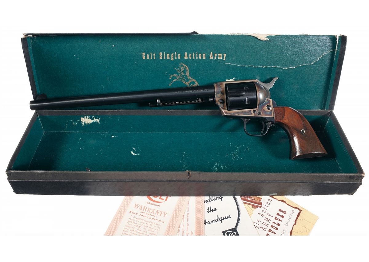 Manufactured in 1958, Colt manufactured approximately 3,900 of these Buntline Specials from 1957 to 1975. Standard one line address on top of the barrel and "COLT BUNTLINE SPECIAL .45" on the left side. The bottom of the barrel is marked with the stock number "BB2357" just ahead of the cylinder pin. Two line, three patent date marking on the left side of the frame followed by the Rampant Colt. The matching serial number is marked on the bottom of the frame and on the left side of the grip straps under the grips. Both grip panels are numbered "572". The matching assembly number "75" is marked on the right side back of the frame and on the loading gate. Standard blade front and frame notch rear sights, casehardened frame, blue on the remaining parts and fitted with smooth two-piece walnut grips. Complete with the original black hinged lid box numbered to the gun.