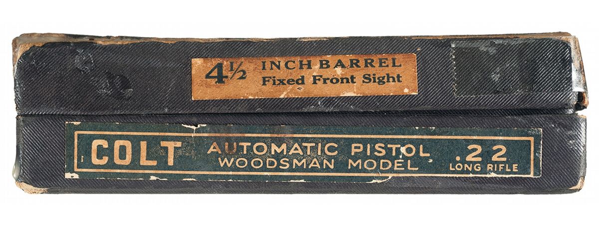 Manufactured in 1940. The left side of the barrel is marked with the two line address/patent dates, the left side of the frame is marked "THE WOODSMAN" and the left side of the slide is marked "COLT" followed by the two line caliber marking and the Rampant Colt. The serial number is on the front strap. The back strap is marked with horizontal lines indicating the pistol is designed for high velocity ammunition. Fixed blade front sight and windage adjustable rear sight, blue Colt woodsman marked magazine and fitted with checkered walnut grips. Comes with the original hinged lid black box numbered to the gun, instruction manual, test target, hanging tag and "Shooting Suggestions" pamphlet.