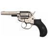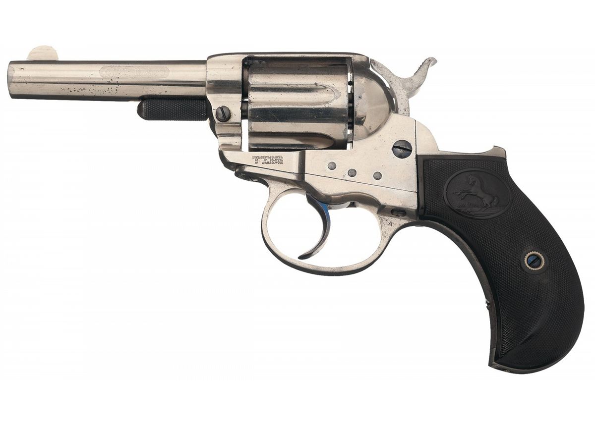 Manufactured in 1885, in the short barreled ejectorless "Sheriff" configuration. Fixed sights with the two line Hartford address on top of the barrel and the etched "COLT D.A. 38" panel on the left. The left side of the frame is marked with the three line, three date patent information on the left side, the matching serial number is marked on the frame, trigger guard and back strap and the assembly number "779" on the loading gate. All nickel finish with niter blue hammer, trigger and screw heads. Fitted with checkered hard rubber bird's head grips with Rampant Colt in an oval at the top.