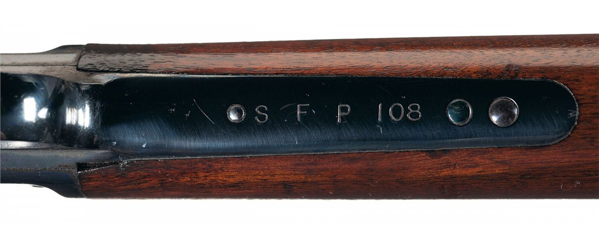 This is an excellent example of one of 401 Lighting Rifles purchased by the San Francisco Police Department in 1898. The San Francisco Police Department was the only department to adopt the slide action rifle, which was not as popular or reliable as the lever action rifles of the day. These rifles were serial numbered in their own special range, SFP1 to SFP401. The "number" was stamped on the lower tang, with this particular rifle being "SFP 108". The two line address/patent dates is marked on the top of the barrel ahead of the rear sight and "44 Cal." at the breech. The Rampant Colt is on the left side of the receiver. D.W. King blade front and adjustable semi-buckhorn rear sights. Niter blue loading gate and trigger. Mounted with a smooth walnut forearm and straight grip stock with a steel crescent buttplate.