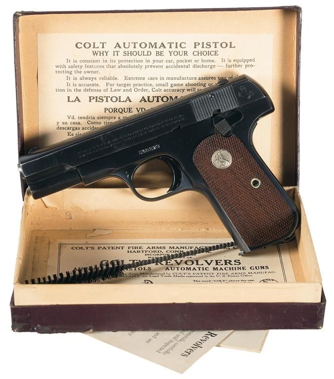 Manufactured in 1931. Fixed sights, with the 2-line address and patent dates on the left side of the slide, the Rampant Colt behind the serrations and "COLT AUTOMATIC/CALIBRE 32 RIMLESS SMOKELESS" below the ejector port. The trigger guard is marked "75" and "1/VP". Checkered walnut grips, with Rampant Colt medallions. With a Colt "black box", properly hand numbered to match, with a cleaning rod and instruction sheets.