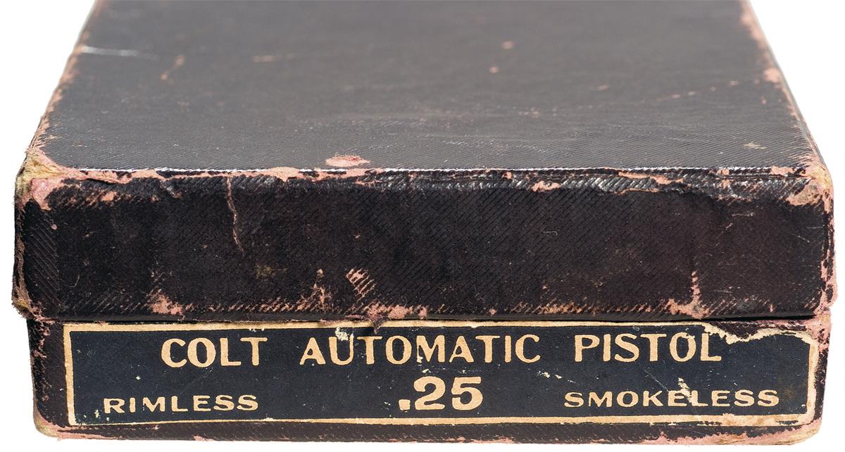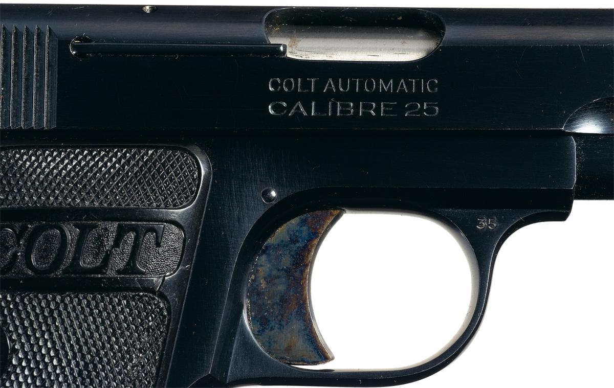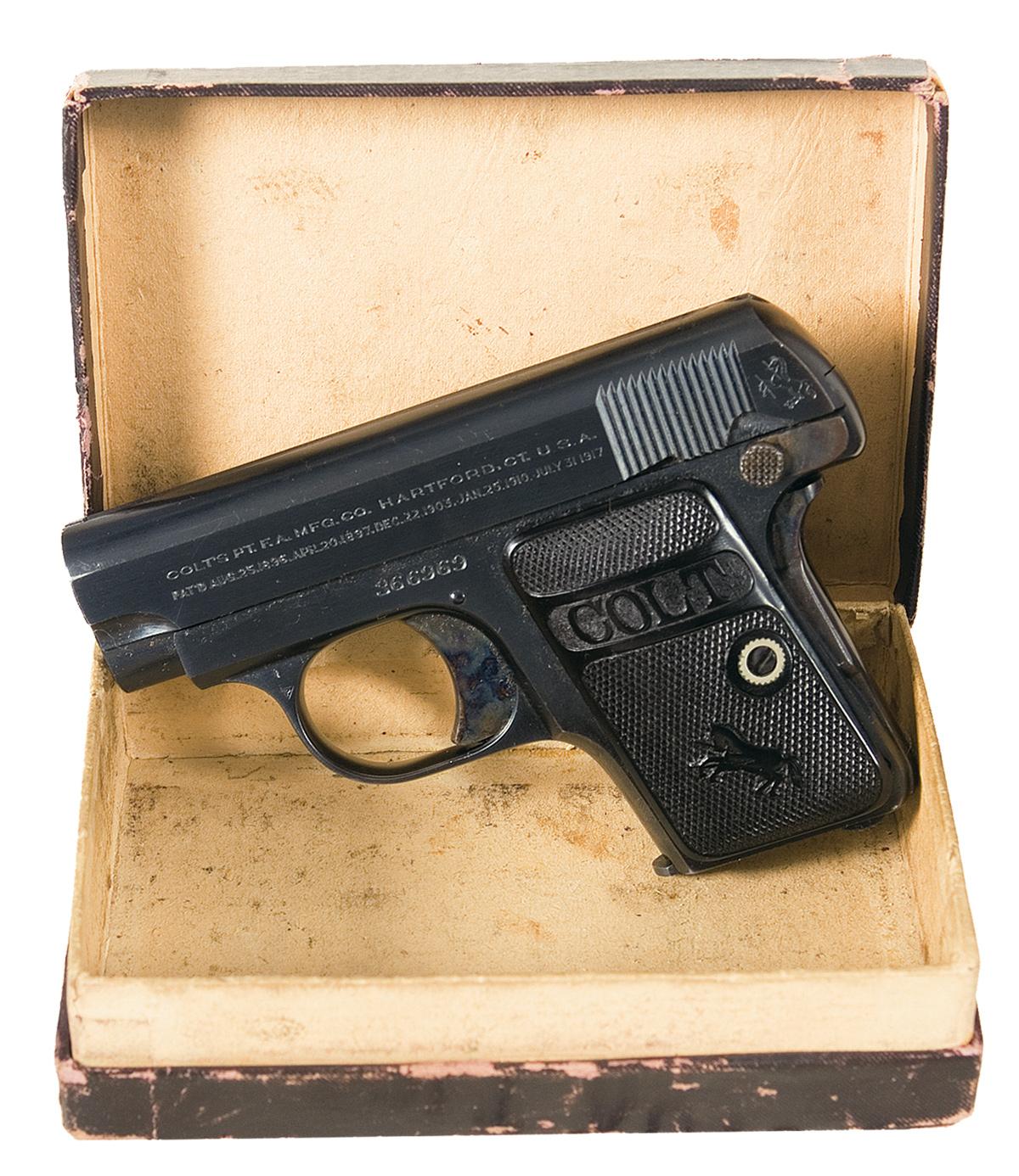 Manufactured in 1927. Standard two line address/patent dates marked on the left side of the slide, Rampant Colt behind the serrations, serial number on the left side of the frame and "COLT AUTOMATIC / CALIBRE 25" on the right side of the slide. Casehardened grip safety, thumb safety and trigger. Colt marked two tone magazine and fitted with Colt banner/Rampant Colt checkered hard rubber grips. Complete with factory black box and instructions.