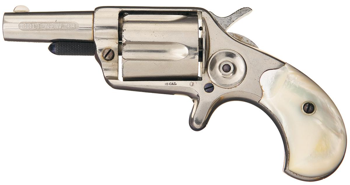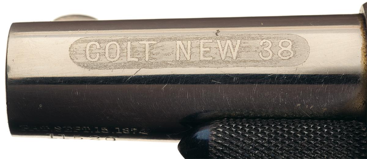 Manufactured in 1881. Two line address on top of the barrel, etched "COLT NEW 38" on the left side, 1874 patent date and serial number on the underside and "38 CAL" on the left side of the frame below the cylinder. Blade front, frame notch rear sights, nickel finish with niter blue cylinder pin, trigger, hammer top and screws, and fitted with smooth two piece pearl grips. Matching serial number on barrel and frame.